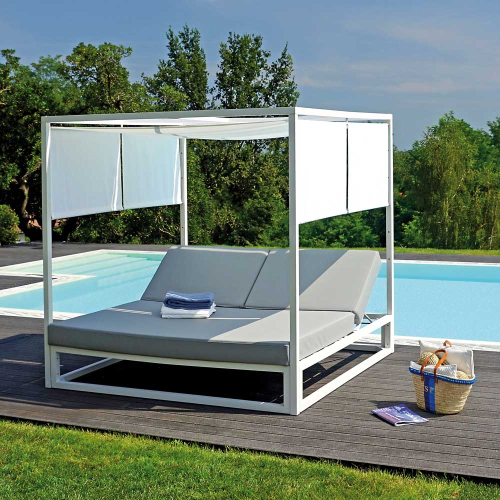 Canapé-lit extérieur avec structure en aluminium blanc et dossier double inclinable.