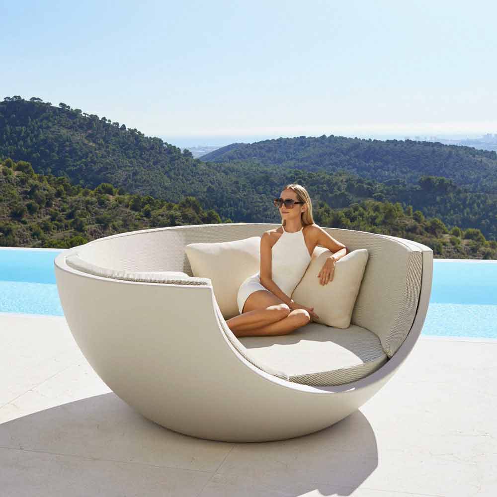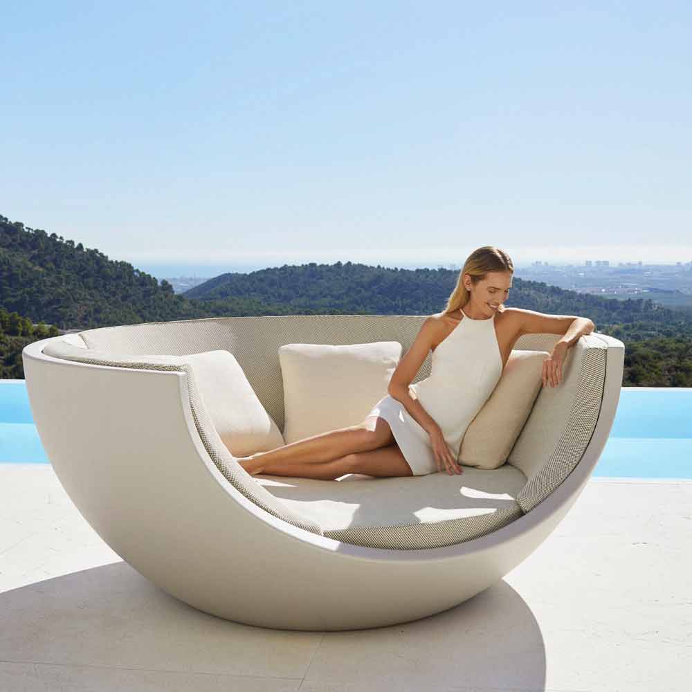 Lit de repos d'extérieur de luxe avec un design circulaire et rotatif en polyéthylène de différentes couleurs à la finition mate.