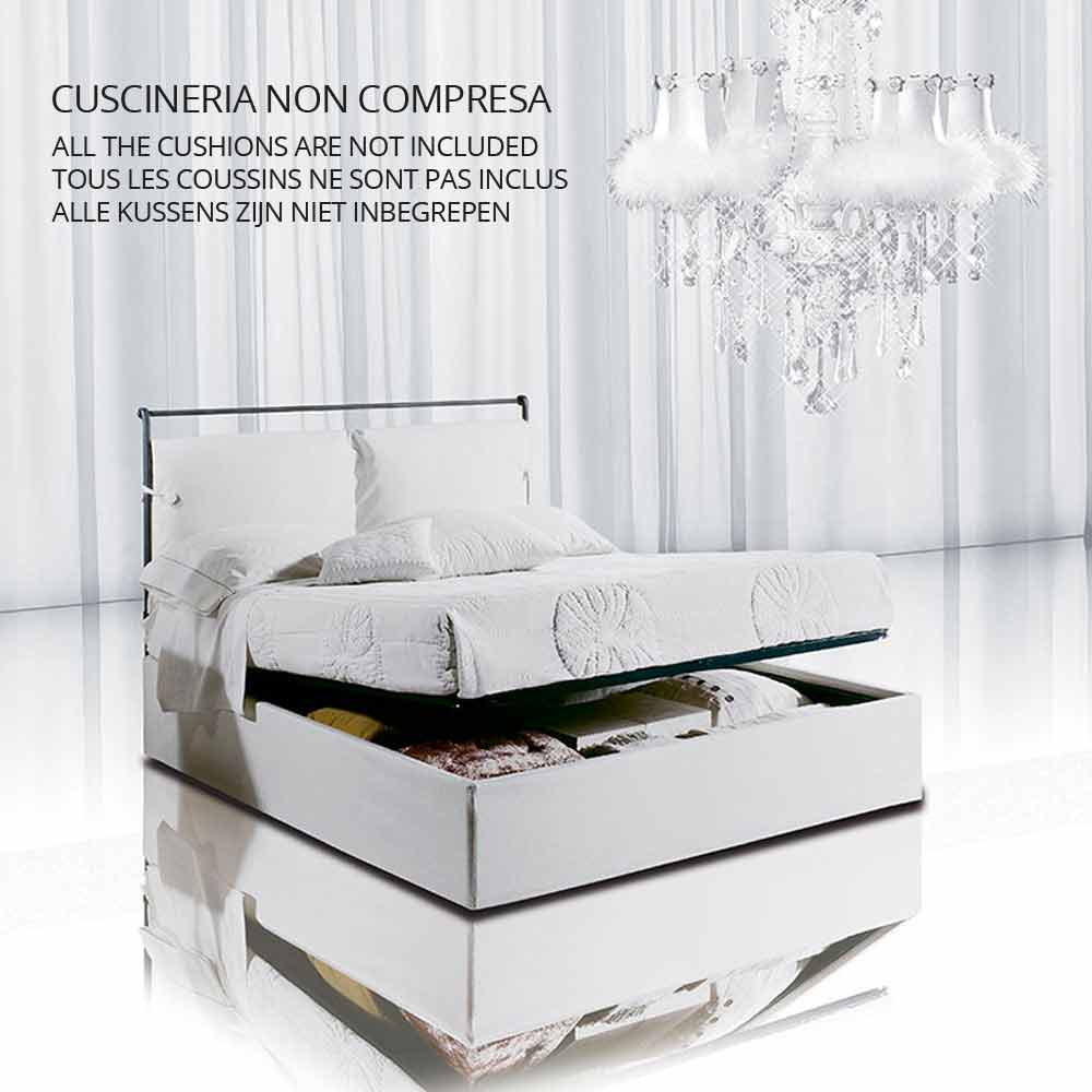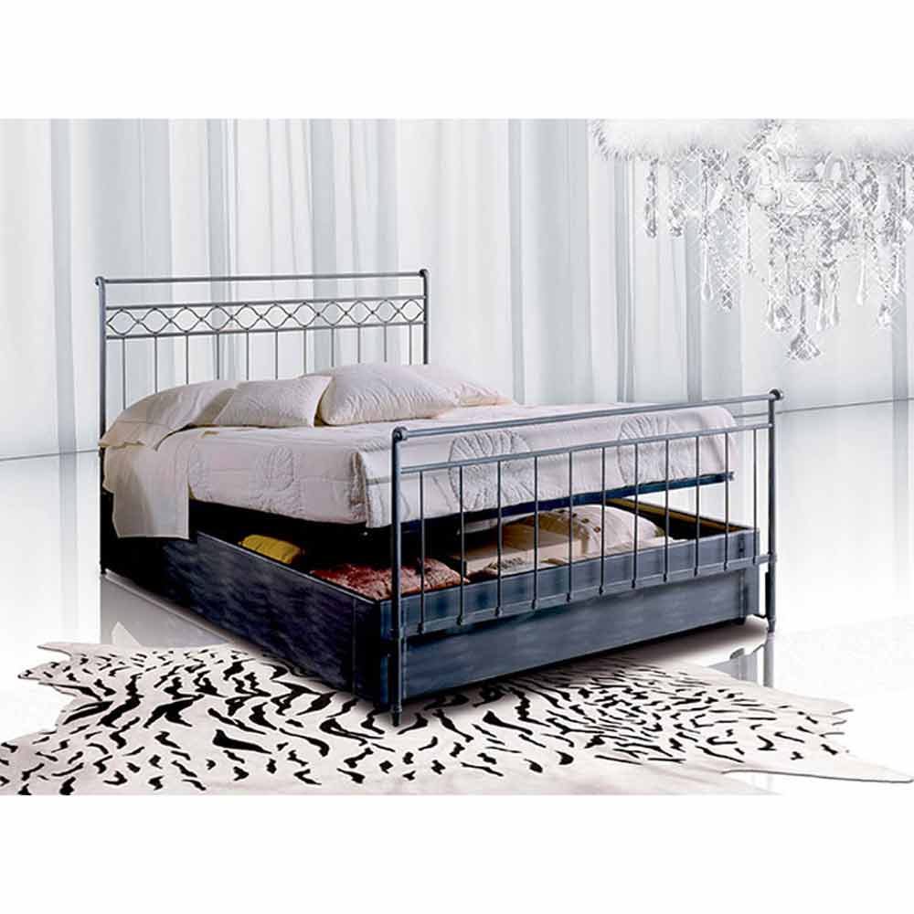 Le lit en fer forgé dans la variante TÊTE DE LIT DOUBLE AVEC PIED DE LIT ET CONTENEUR comprend un sommier à lattes pouvant accueillir un matelas de 160 x 190 cm. Le sommier que nous fournissons est doté d'un système spécial de retenue du matelas qui lui permet d'accueillir également un matelas de 190 cm de long. En cas d'exigences esthétiques particulières, ce modèle, grâce à notre productivité artisanale, peut être modifié en hauteur. Le conteneur est entièrement en métal et peut être peint dans n'importe quelle couleur. Avoir un conteneur en métal garantit d'innombrables avantages à notre lit, notamment la solidité, la facilité de nettoyage et une plus grande capacité. Le conteneur peut dans tous les cas être associé à une cantonnière textile. Cette version avec pied de lit par exemple ne peut être réalisée que grâce à la structure métallique du conteneur, une combinaison très appréciée car elle permet de combiner le classicisme d'un lit complet avec la commodité d'utiliser l'espace de rangement.