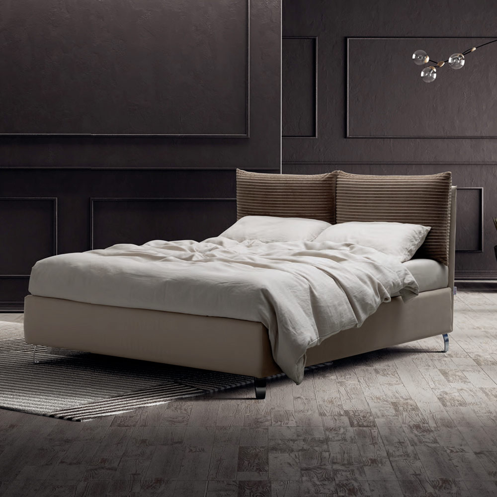 Lit double avec sommier dynamique , coffre de rangement,pieds en métal finition acier poli (hauteur 12 cm) et tête de lit réalisée avec deux coussins moelleux en tissu écologique et vert, en contraste avec le lit en tissu déperlant. Les coussins sont fixés au cadre avec des inserts Velcro adhésifs pratiques qui permettent un retrait pratique et facile. Ce lit est l'incarnation du confort et du design contemporain. C'est une combinaison parfaite de raffinement et de fonctionnalité , conçue pour offrir des nuits de pure détente et un style incomparable.