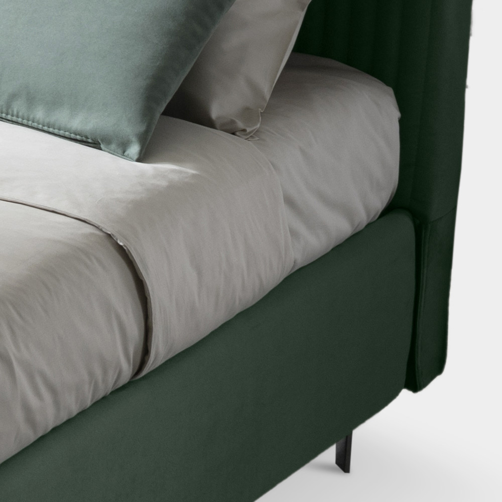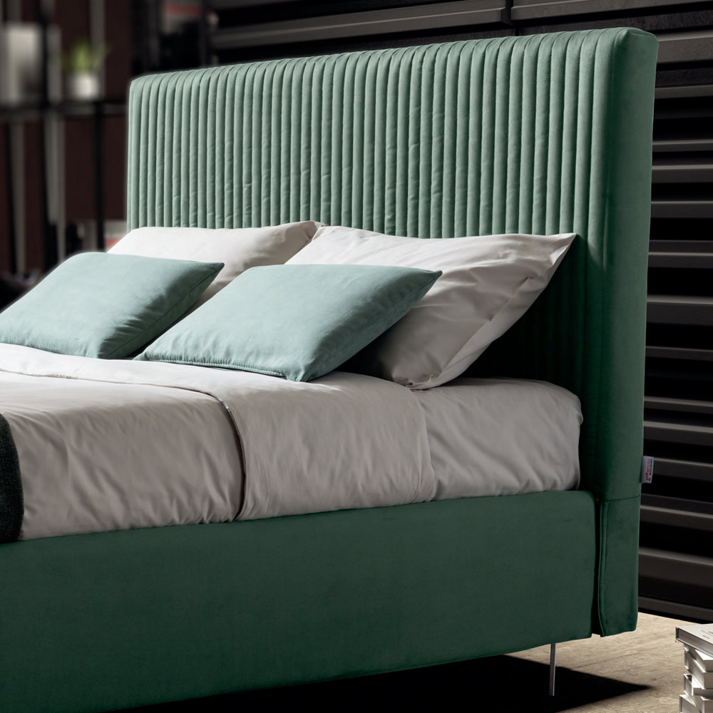 Lit double avec sommier dynamique , coffre de rangement,pieds en métal finition acier poli (hauteur 12 cm) et tête de lit épaisse en tissu hypoallergénique, antitache, respirant et anti-rétrécissement , réalisé avec un procédé de matelassage particulier avec des bandes étroites et de multiples lignes verticales qui mettent en valeur sa ligne tendance et originale. Ce lit est l'incarnation du confort et du design contemporain. C'est une combinaison parfaite de raffinement et de fonctionnalité , conçue pour offrir des nuits de pure détente et un style incomparable.