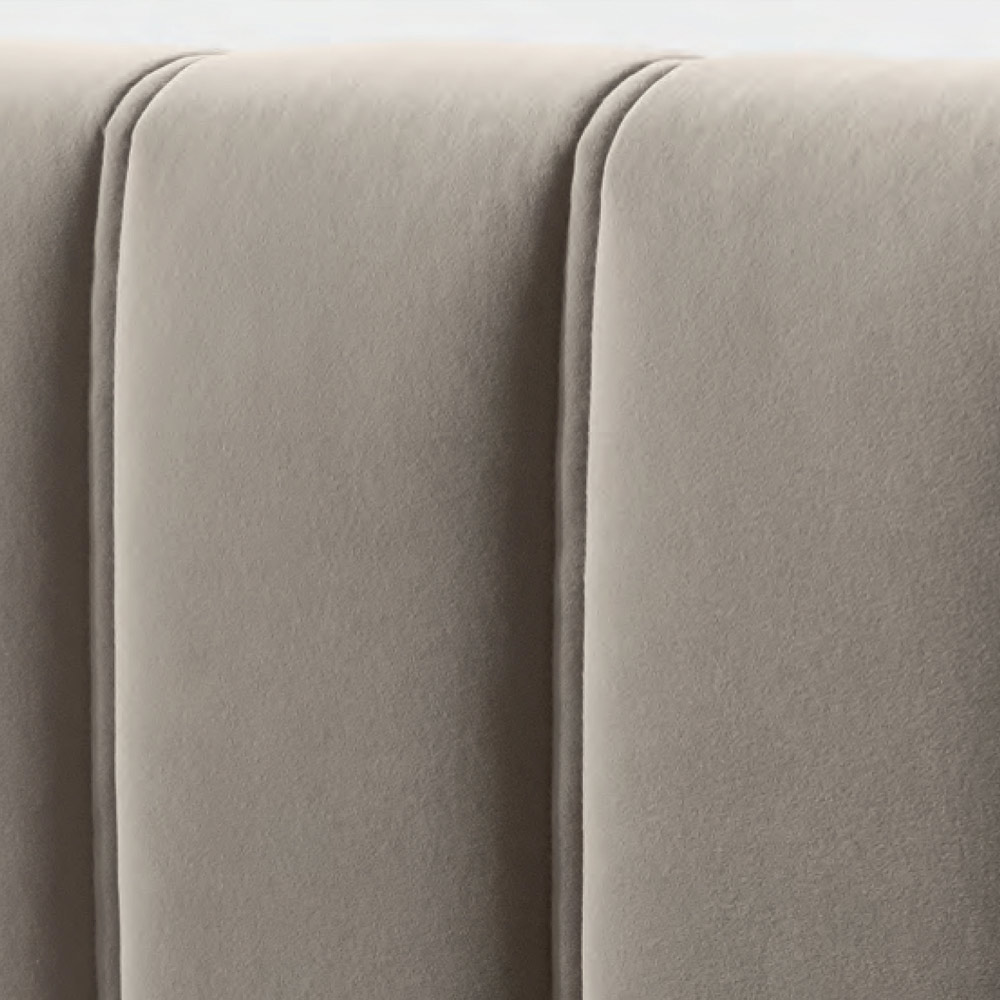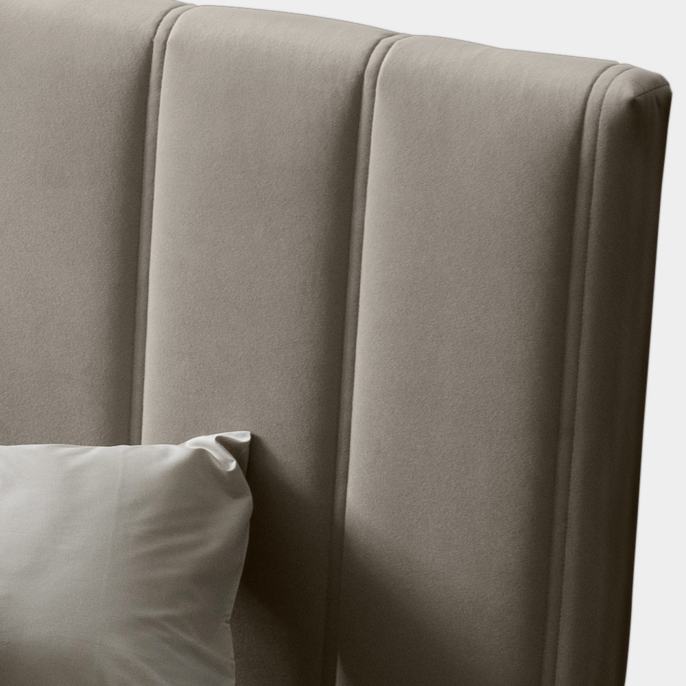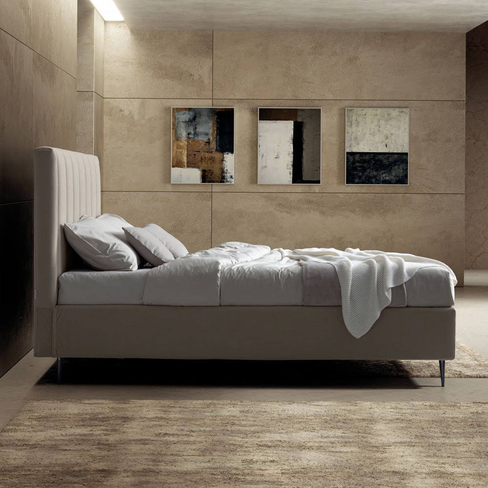 Lit double avec sommier dynamique , coffre de rangement, pieds en métal finition moka (hauteur 15 cm) et tête de lit épaisse en tissu ignifuge, réalisé avec un procédé de matelassage particulier avec de larges bandes verticales qui met en valeur la rigueur et les lignes épurées. Ce lit est l'incarnation du confort et du design contemporain. C'est une combinaison parfaite de raffinement et de fonctionnalité , conçue pour offrir des nuits de pure détente et un style incomparable.