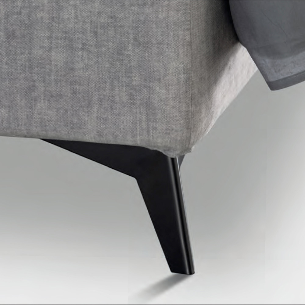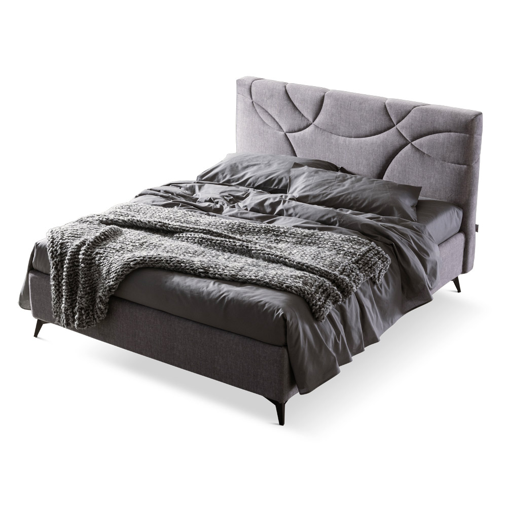 Lit double avec sommier dynamique , coffre de rangement, pieds en métal finition anthracite (hauteur 13,5 cm) et tête de lit épaisse en tissu ignifuge, réalisé avec un procédé de matelassage particulier de courbes croisées qui met en valeur sa douceur et lui confère une forte personnalité. Ce lit est l'incarnation du confort et du design contemporain. C'est une combinaison parfaite de raffinement et de fonctionnalité , conçue pour offrir des nuits de pure détente et un style incomparable.