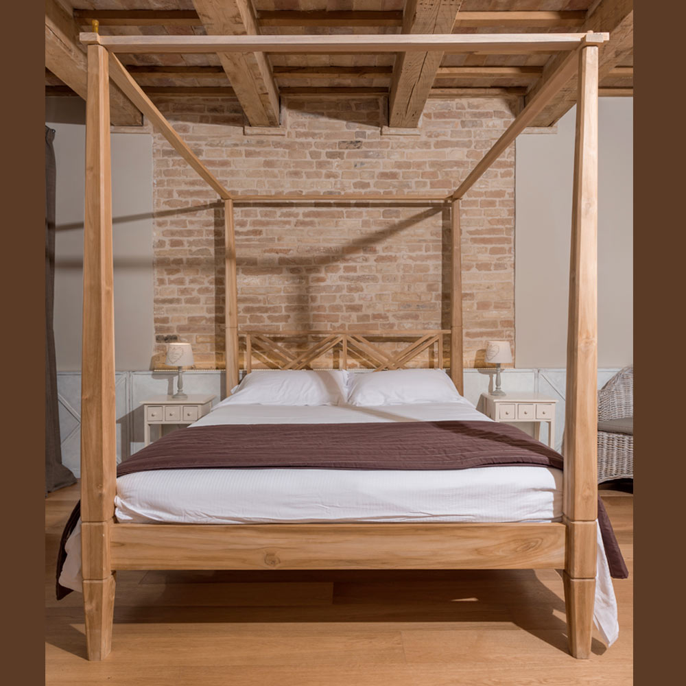 Ce lit à baldaquin en teck massif est un meuble de charme, capable de transformer la chambre en un espace raffiné et évocateur. Sa structure robuste et sa fabrication artisanale mettent en valeur le grain naturel du bois , créant une atmosphère chaleureuse et élégante, empreinte d'intemporalité.
