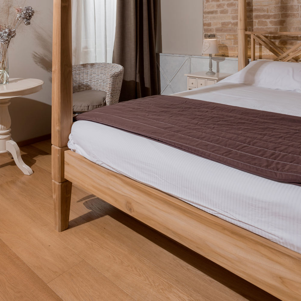 Ce lit à baldaquin en teck massif est un meuble de charme, capable de transformer la chambre en un espace raffiné et évocateur. Sa structure robuste et sa fabrication artisanale mettent en valeur le grain naturel du bois , créant une atmosphère chaleureuse et élégante, empreinte d'intemporalité.