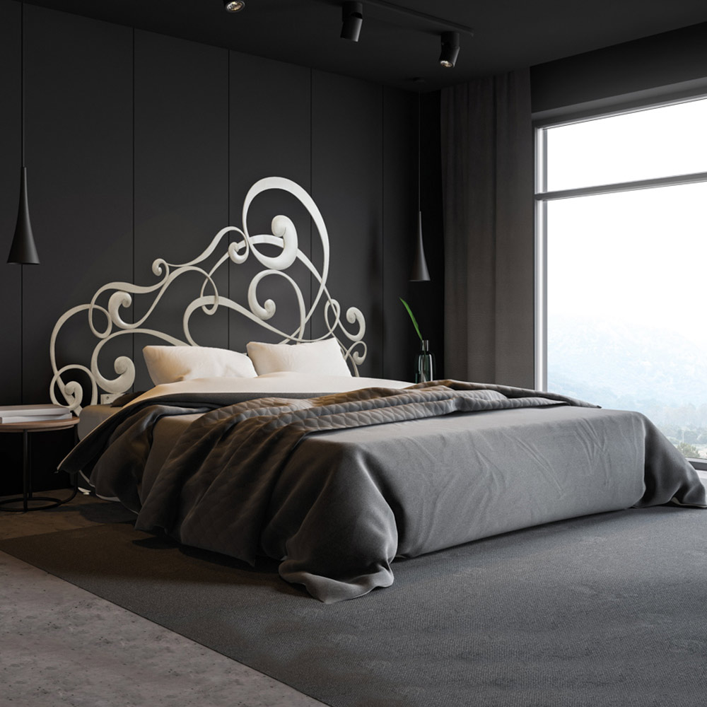 Lit double composé d'une tête de lit et d'un cadre de lit en fer massif à 95%et à 5% en tubulaire et finition peinte en poudre. Produit qui donne à la pièce une atmosphère romantique et intemporelle grâce à l'union des finitions élégantes et sinueuses et de la qualité des matériaux.