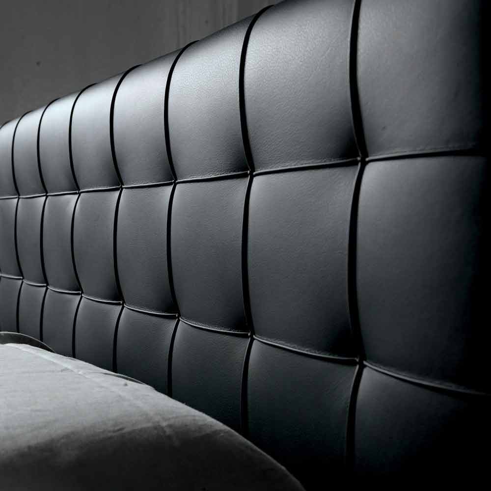 La tête de lit capitonnée, revêtue de cuir pleine fleur de première qualité, met en valeur la structure en noyer massif du lit, pour un résultat esthétique élégant et évocateur.