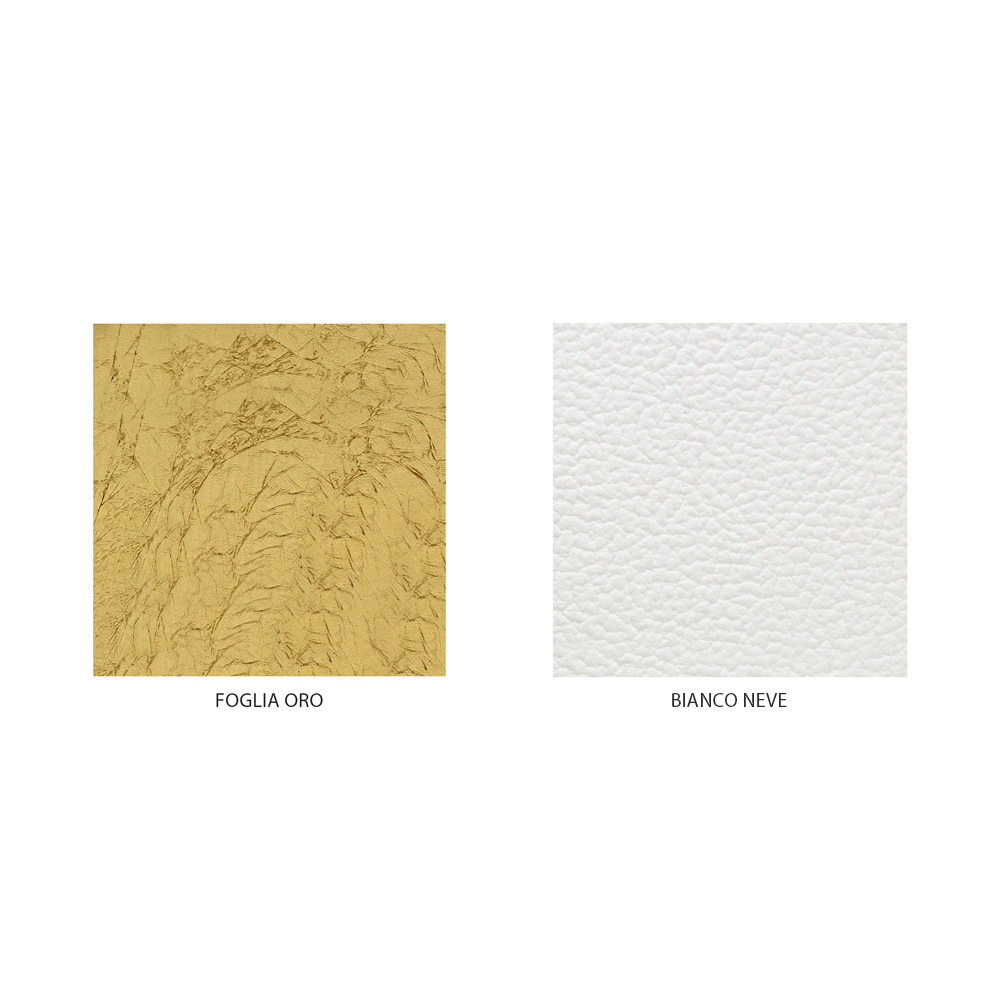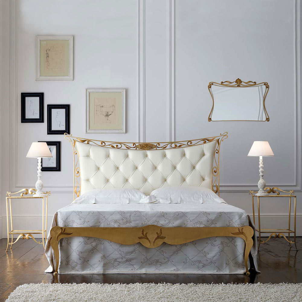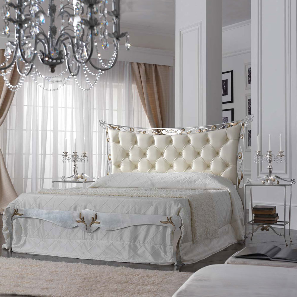 Lit double composé d'une tête et d'un pied de lit en fer massif coordonné, finition peinture feuille fabriquée à la main et rembourrage en cuir véritable, finition blanc neige. 2 tables de chevet réalisées avec structure en fer massiffinition artisanale en feuille d'argent meccata ou feuille d'or et 2 plateaux en verre. Sont également inclus un matelas TENCEL avec 980 ressorts ensachés + 4 cm de mémoire, housse amovible et dispositif médical et 2 oreillers à mémoire de forme , complets avec taie d'oreiller TENCEL amovible et lavable.