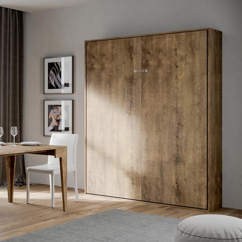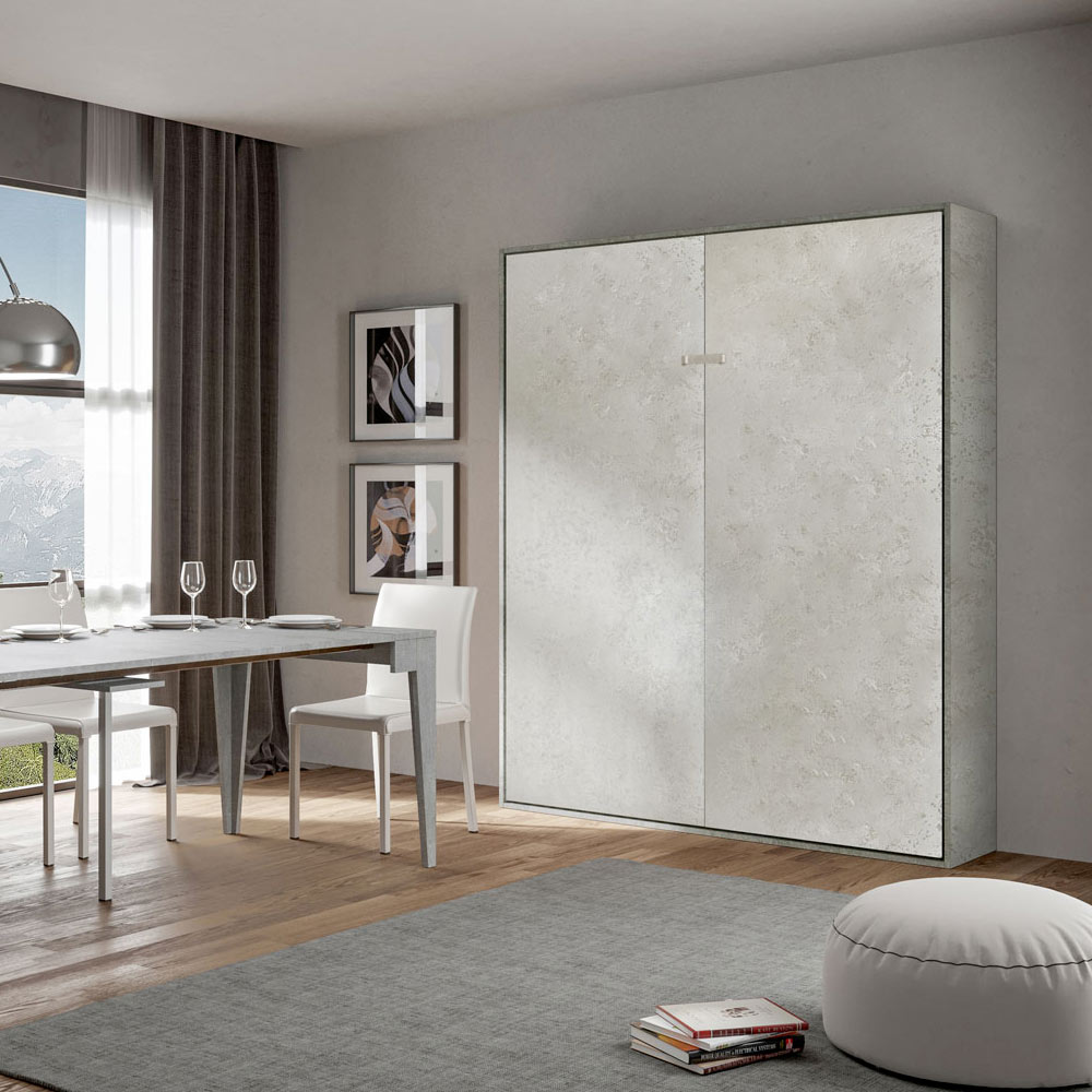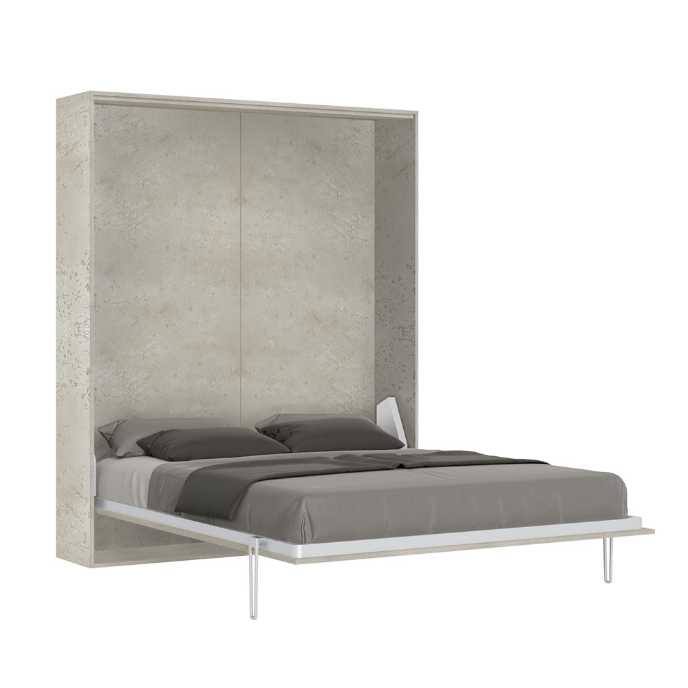 Le cadre de lit est fabriqué en panneaux de particules mélaminés de 18 mm d'épaisseur , garantissant résistance et durabilité. Le mécanisme d'ouverture, fluide et sûr, transforme le mur en un lit confortable d'un simple geste.