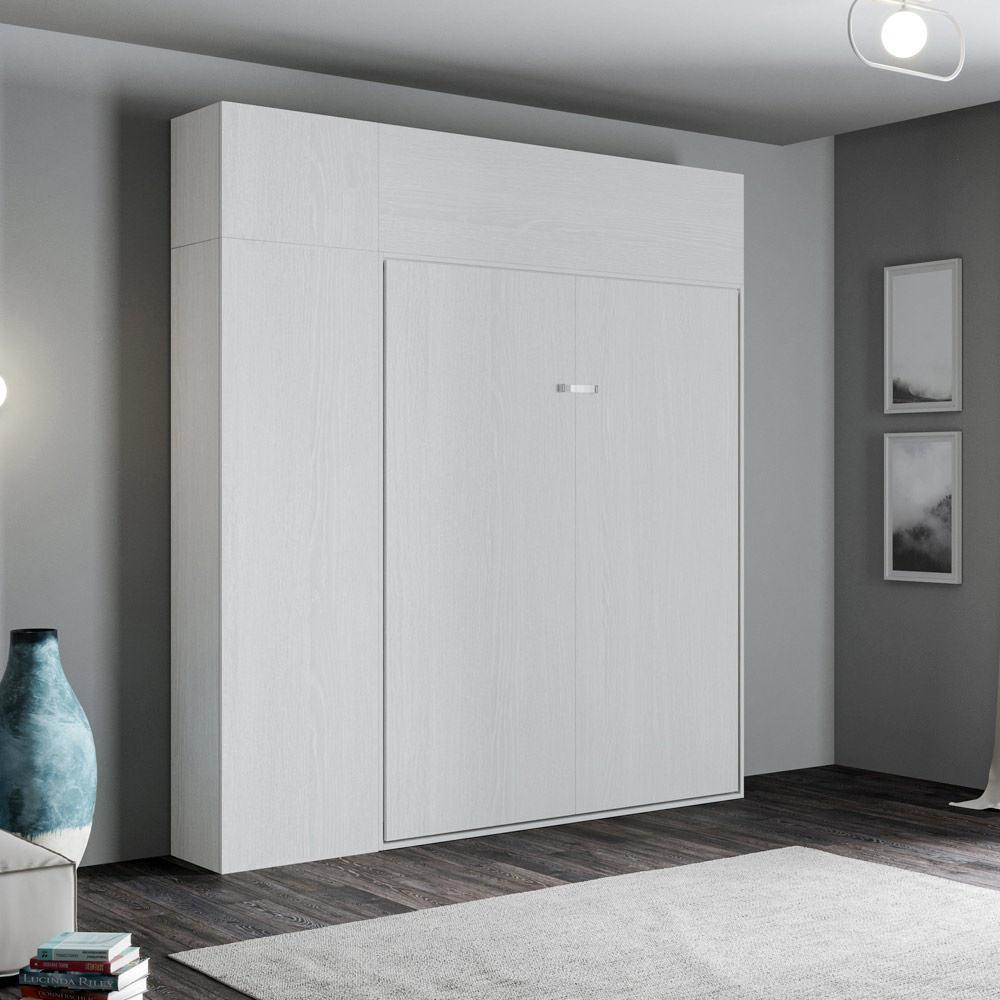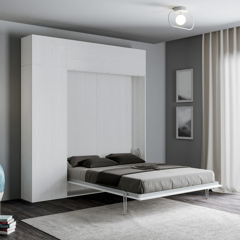Le cadre de lit est fabriqué en panneaux de particules mélaminés de 18 mm d'épaisseur , garantissant résistance et durabilité. Le mécanisme d'ouverture, fluide et sûr, transforme le mur en un lit confortable d'un simple geste.