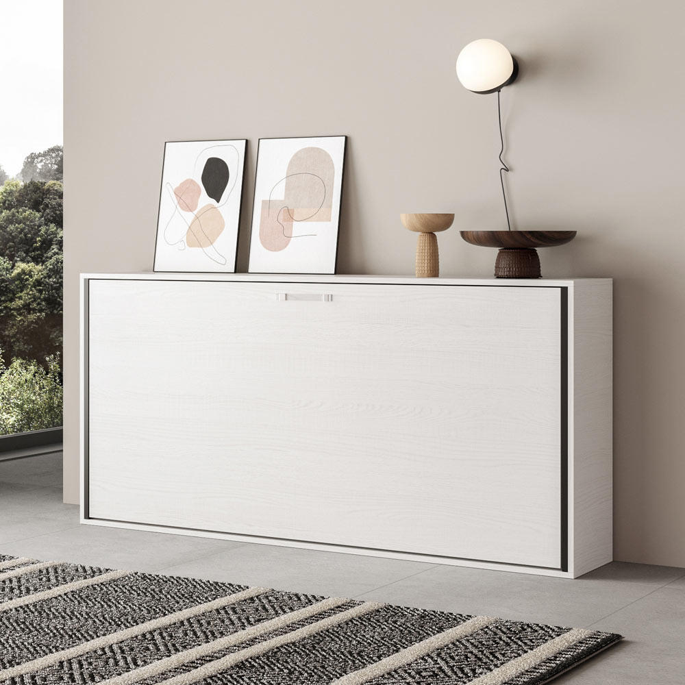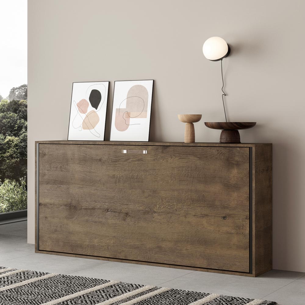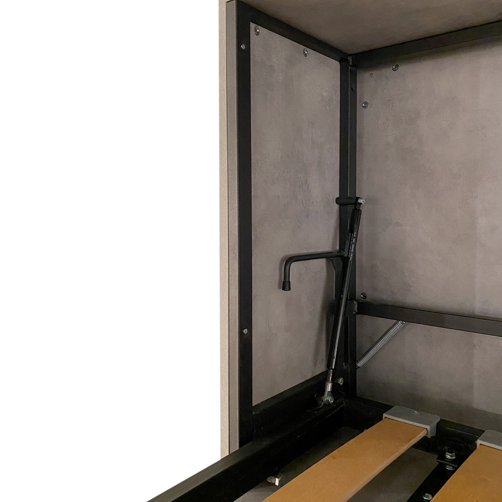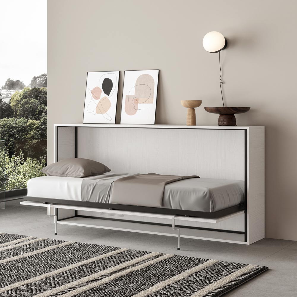Lit escamotable horizontal réalisé avec une structure en panneaux de particules de bois anoblis de 18 mm d'épaisseur, structure du sommier en fer renforcé peint avec des poudres époxy couleur aluminium gaufré. Le mécanisme d'ouverture est équipé d'un système anti-fermeture avec verrouillage de sécurité avec poignées de déverrouillage latérales. Le lit reste stable grâce à un mécanisme de sécurité interne qui assure sa rigidité. Lors de l'ouverture, le pied doit être extrait manuellement pour permettre au sommier de reposer au sol. La descente du lit est facilitée par la poignée incluse. Comprend une base orthopédique composée de lattes en bois lamellé de 85x190 cm avec sangles de matelas.