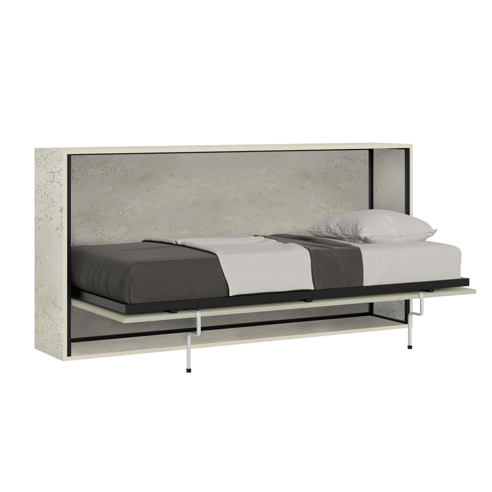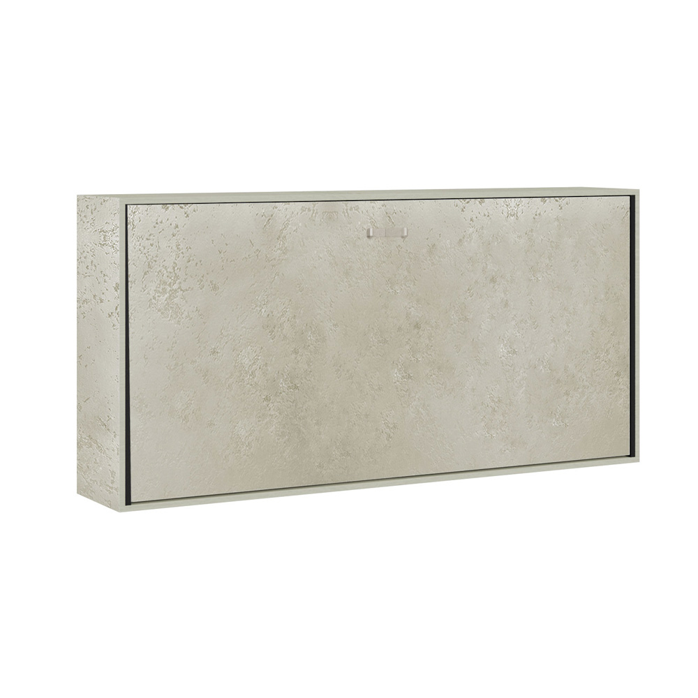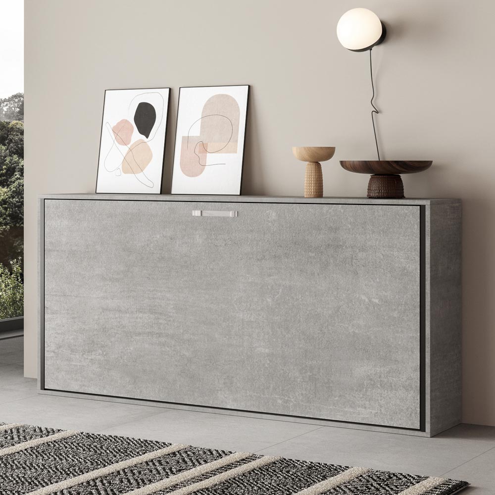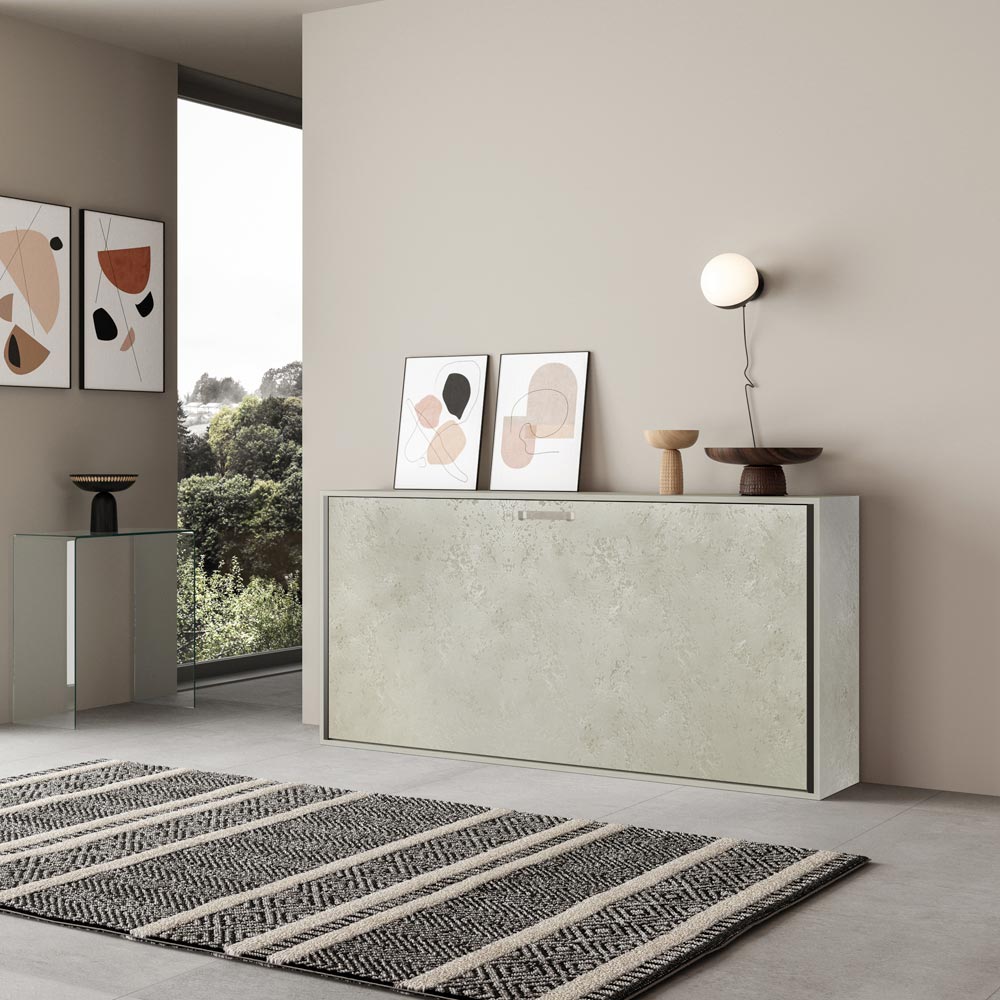 Lit escamotable horizontal réalisé avec une structure en panneaux de particules de bois anoblis de 18 mm d'épaisseur, structure du sommier en fer renforcé peint avec des poudres époxy couleur aluminium gaufré. Le mécanisme d'ouverture est équipé d'un système anti-fermeture avec verrouillage de sécurité avec poignées de déverrouillage latérales. Le lit reste stable grâce à un mécanisme de sécurité interne qui assure sa rigidité. Lors de l'ouverture, le pied doit être extrait manuellement pour permettre au sommier de reposer au sol. La descente du lit est facilitée par la poignée incluse. Comprend une base orthopédique composée de lattes en bois lamellé de 85x190 cm avec sangles de matelas.