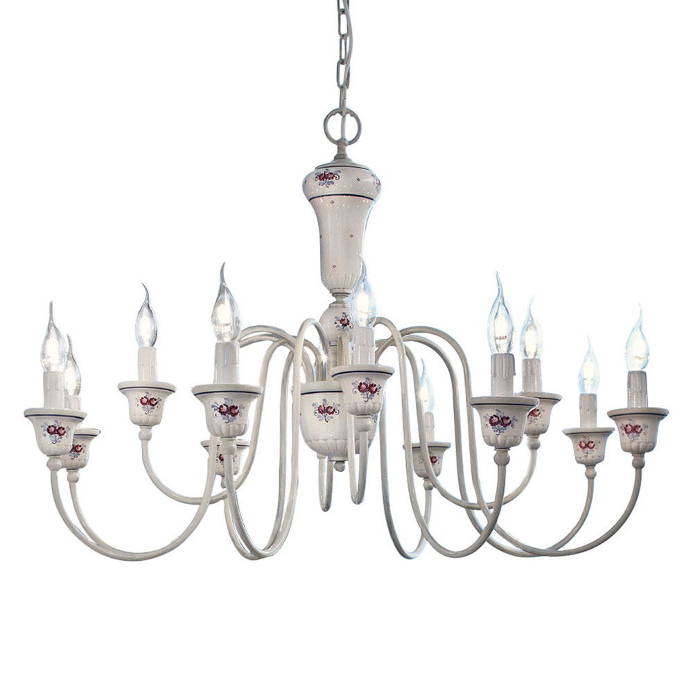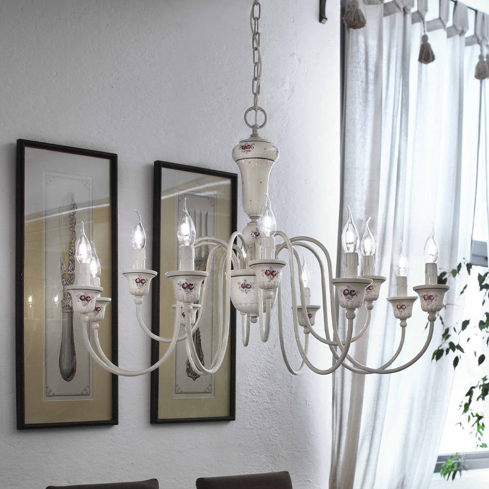 Ce lustre 12 lumières est entièrement réalisé à la main en laiton peint et céramique avec décor floral peint à la main ,mettre en valeur le savoir-faire et les savoir-faire manuels des artisans. Le design se caractérise par la référence au passé, lorsque l'éclairage des pièces était confié à la lumière tamisée des bougies.