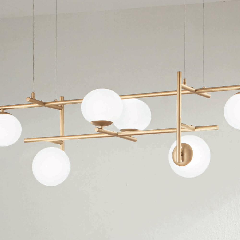 Lustre entièrement fabriqué en Italie en métal peint et verre soufflé finition dorée avec lumière LED et câbles réglables en longueur. Ce produit vise à valoriser la tradition à travers une approche contemporaine où style, classe et innovation fusionnent pour créer de nouvelles formules de design pour meubler et illuminer n'importe quel environnement avec goût et caractère. Les points forts sont la particularité des formes , la qualité des matériaux et l' unicité de la source lumineuse .