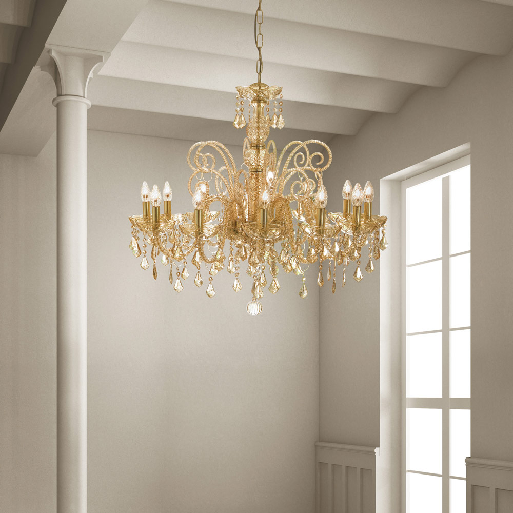 Lustre en verre vénitien avec finition décoration Ambre avec pendentifs nationaux et métal chromé poli . Fabriqué à travers un savoir- faire artisanal , ce complément se caractérise par les magnifiques bras travaillés à la main grâce à la technique de torsion qui crée un résultat exclusif qui rappelle esthétiquement l'entrelacement d'une corde, donnant de la personnalité au lustre. Une véritable pluie de lumière envahit la structure du lustre puis se répand dans l'environnement par réfraction grâce à la magie des paillettes et des pendentifs en cristal aux finitions raffinées, créant ainsi un effet scénographique évocateur et onirique capable d'enchanter et de surprendre. pour son élégance et sa majesté .