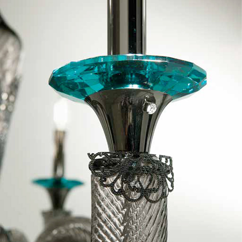 - Corps en verre fumé - détails en verre turquoise - métal bruni ;
