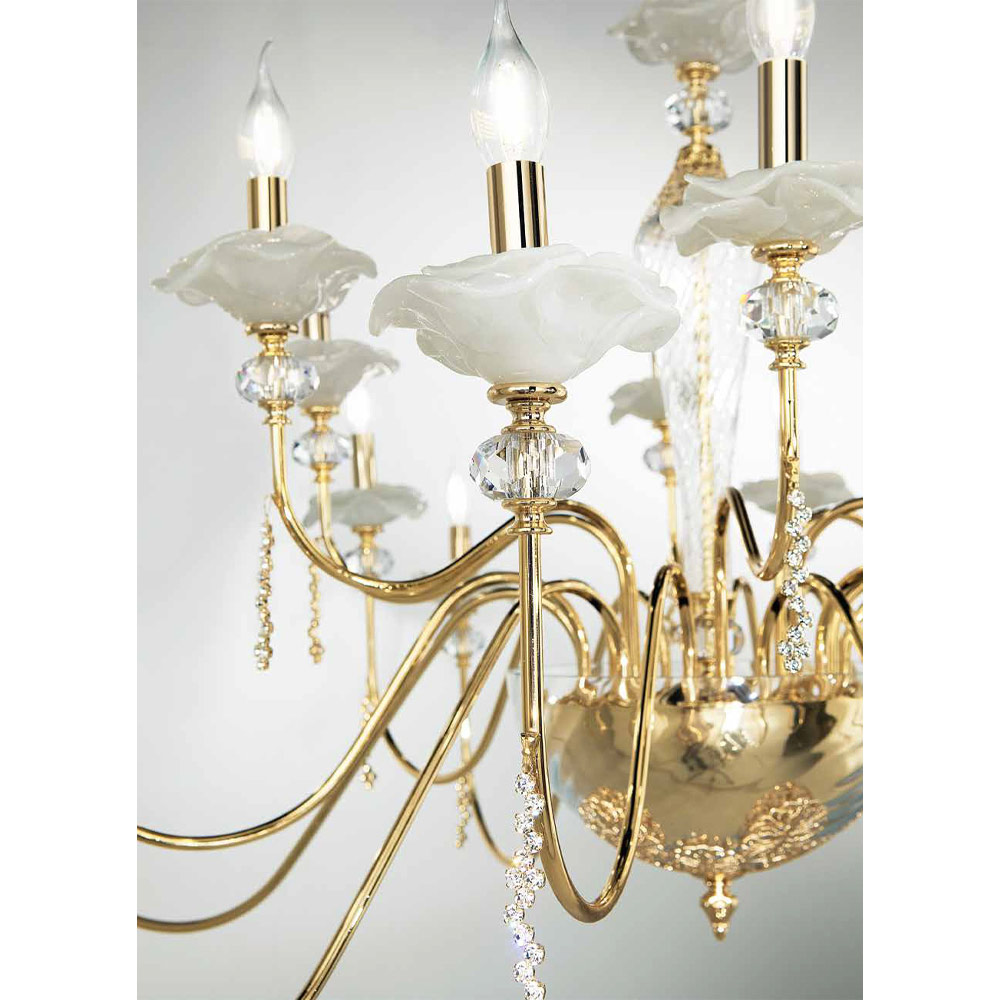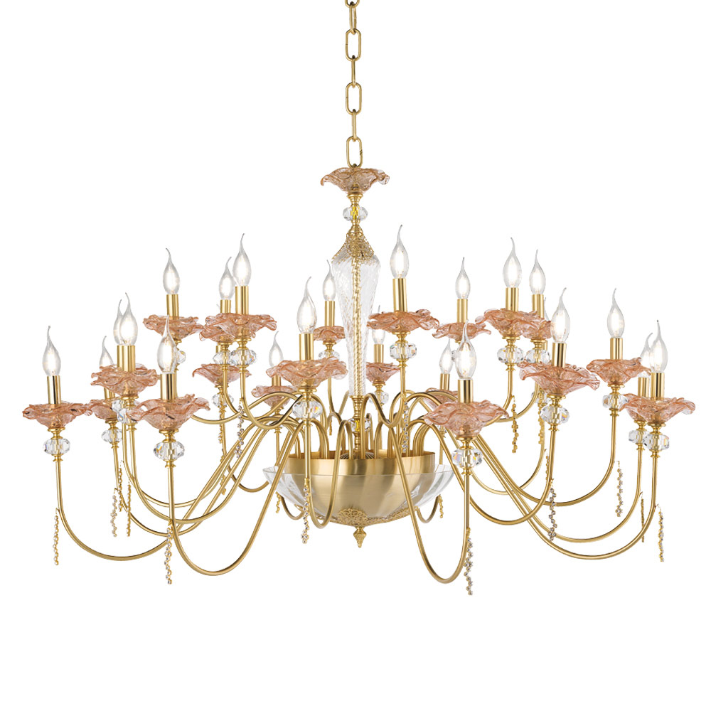 Lustre 24 lumières en verre artisanal avec bourgeons et pampilles en cristal, luxe made in Italy.