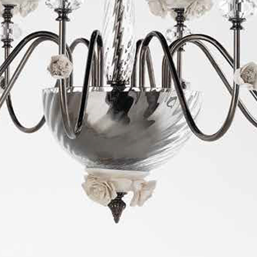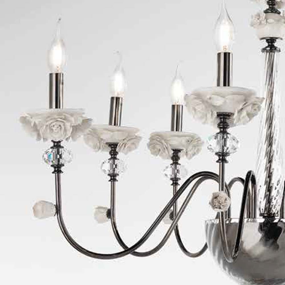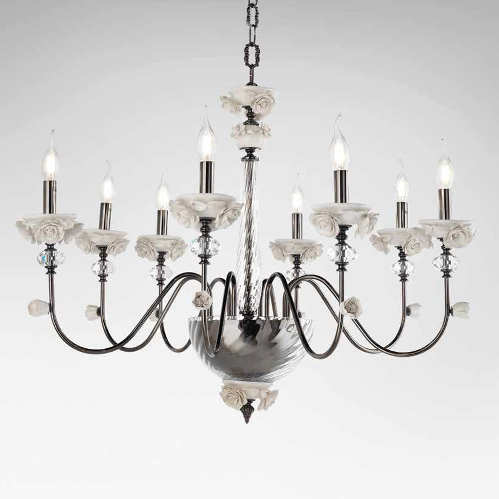 Lustre 8 lumières en porcelaine et verre soufflé, luxe made in Italy.
