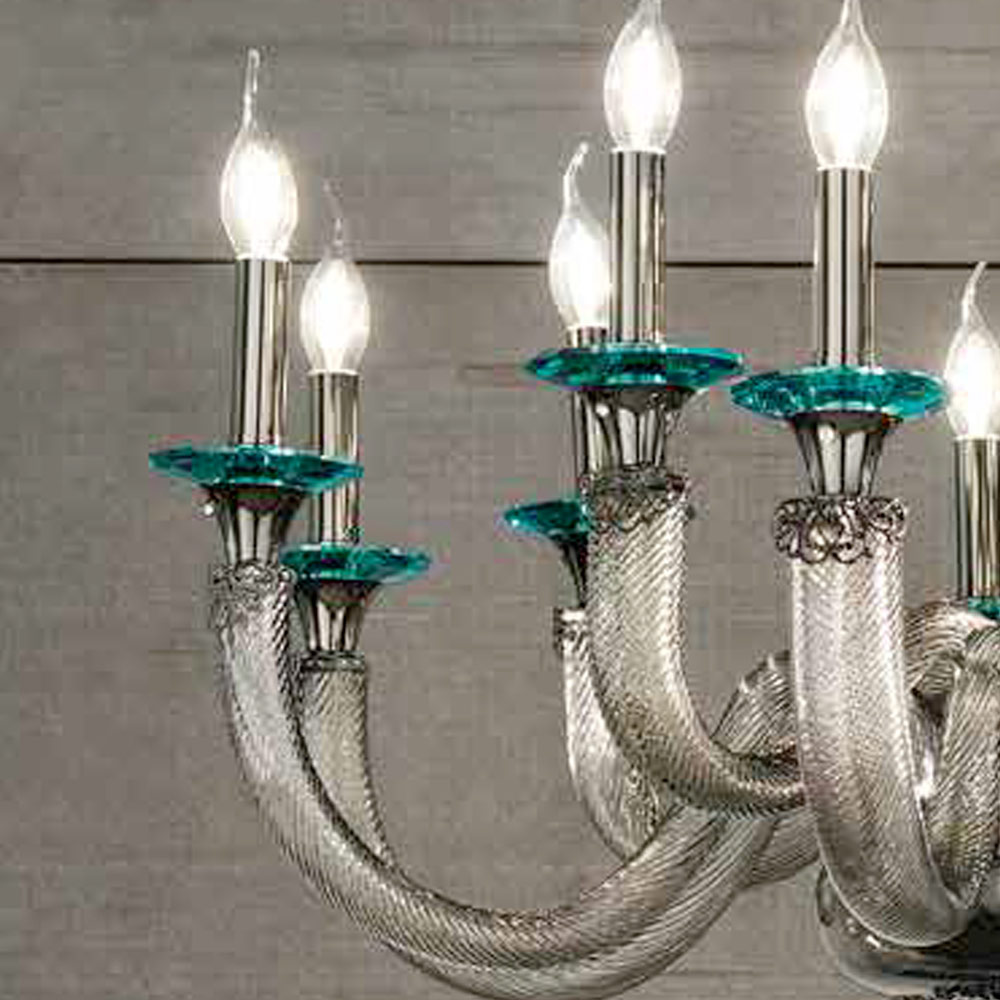 Lustre 8 lumières en verre et cristaux artisanaux, luxe italien.