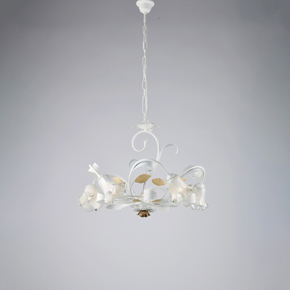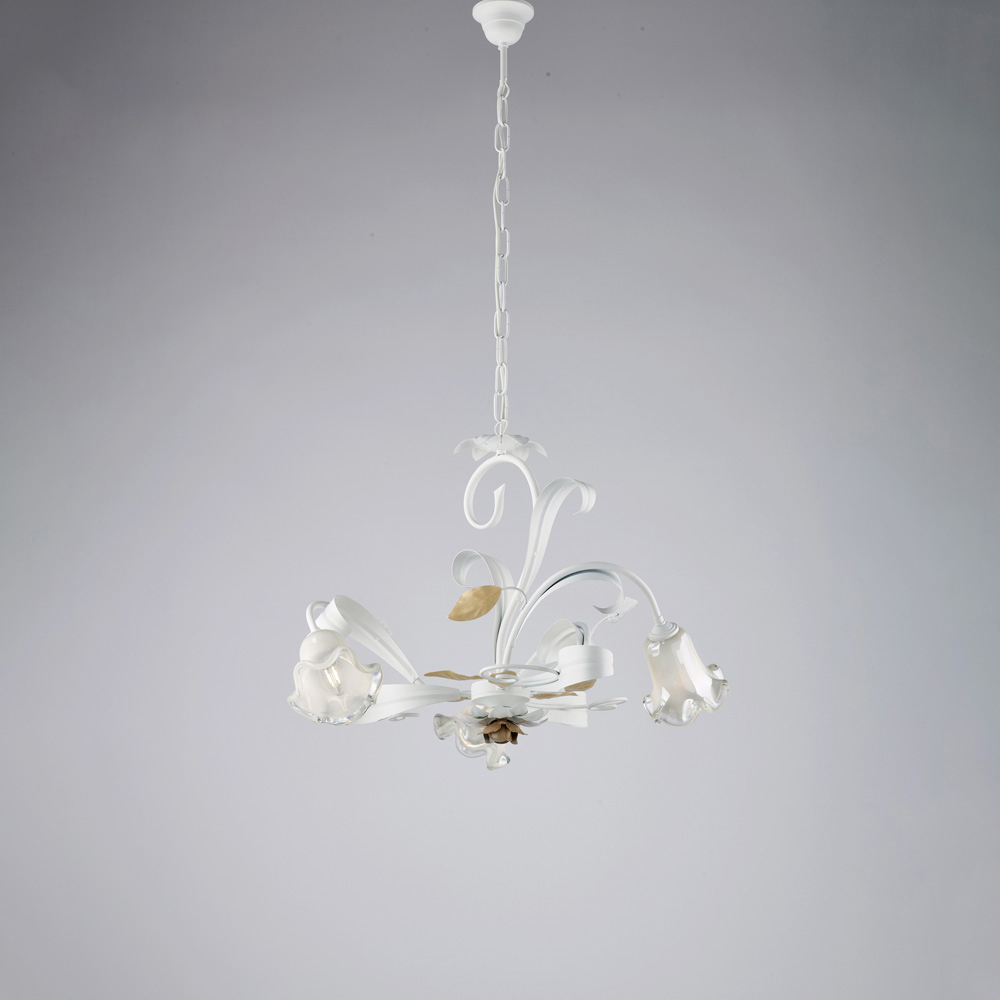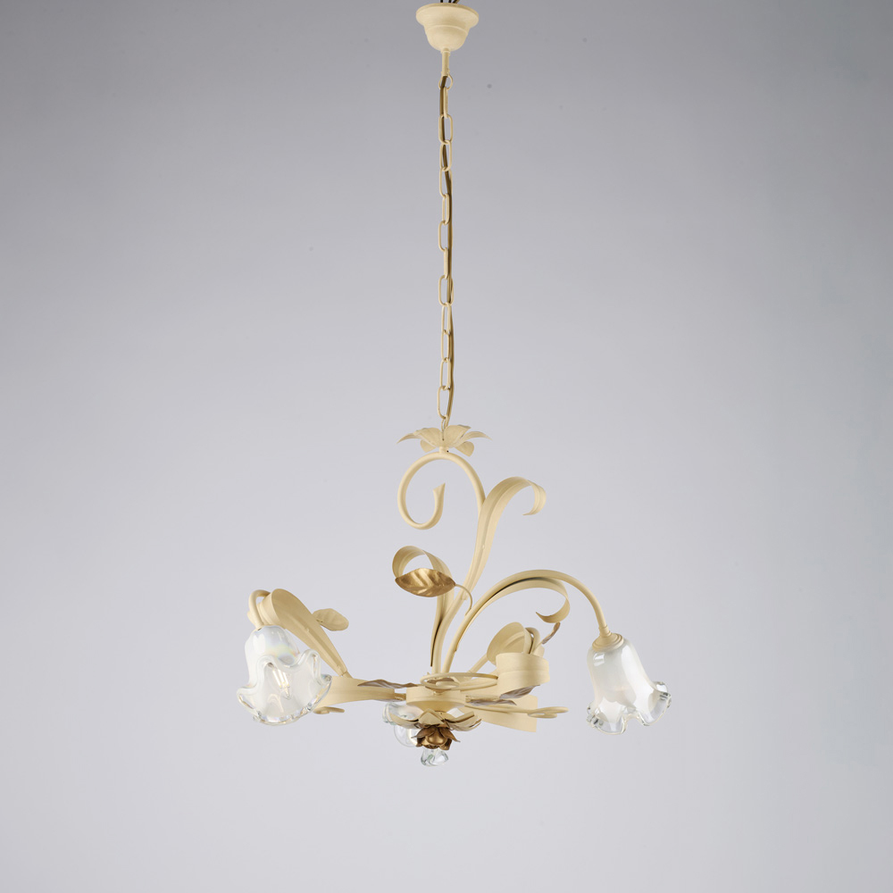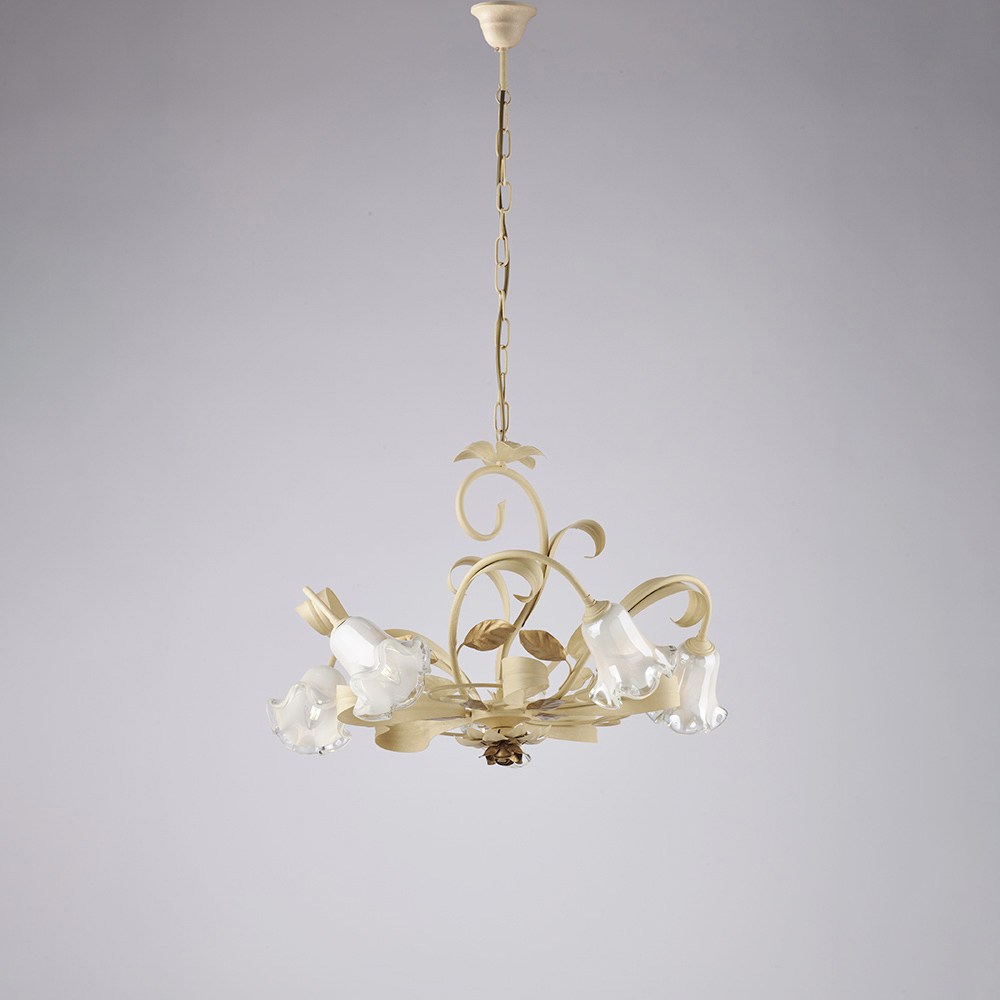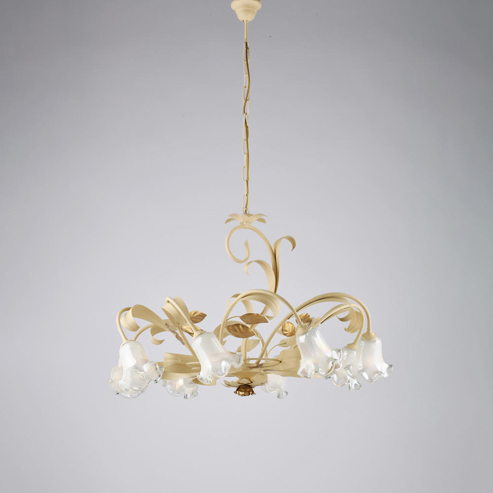 Romantique et élégant, ce lustre classique en fer laqué ivoire, réalisé artisanalement, est une création lumineuse qui évoque le charme de la tradition italienne, réinterprété avec un goût raffiné. Sa structure sinueuse, ornée de volutes décoratives et d'un abat-jour en verre en forme de fleur , confère légèreté et harmonie à l'ensemble, créant une atmosphère chaleureuse et accueillante.