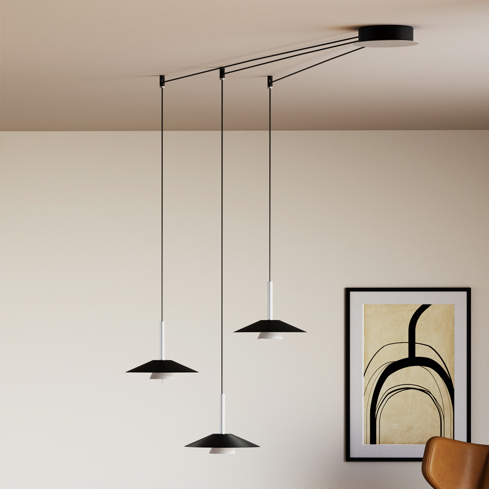 Cette lampe allie parfaitement design contemporain et élégance industrielle , conçue pour les amateurs de détails raffinés et d'une esthétique audacieuse. Sa structure géométrique, avec son diffuseur conique et son grand disque réfléchissant, crée un fascinant jeu de volumes et de contrastes , assurant une lumière directionnelle et enveloppante .
