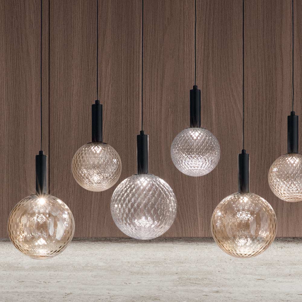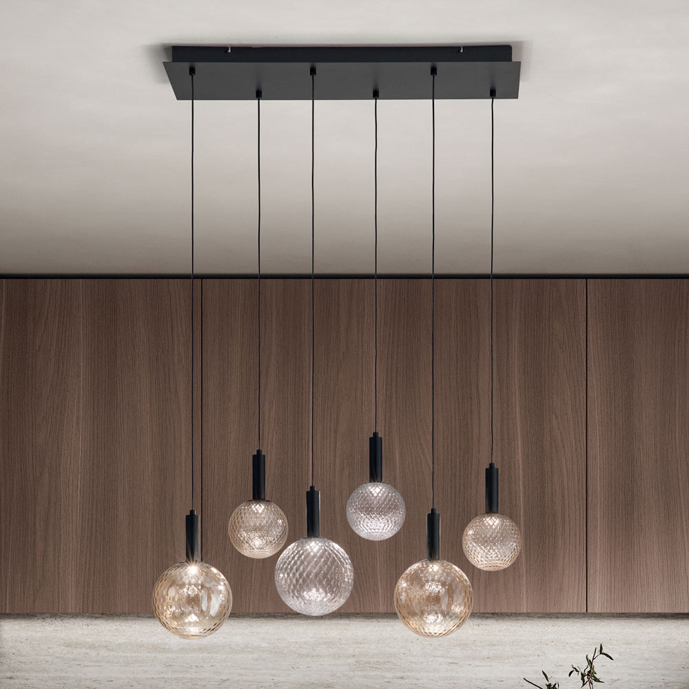 Idéale au-dessus d'une table à manger ou comme point focal dans un salon contemporain , chaque sphère est suspendue avec précision, créant une composition aussi artistique que fonctionnelle . Les différentes finitions de tons de verre ajoutent une touche de classe et de distinction à n'importe quel espace, réfléchissant la lumière de manière à attirer le regard et à illuminer la pièce.