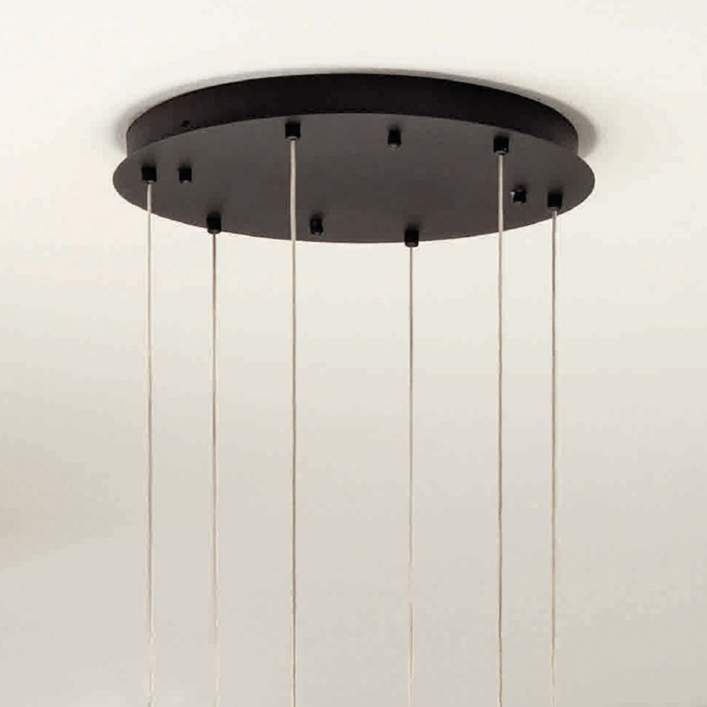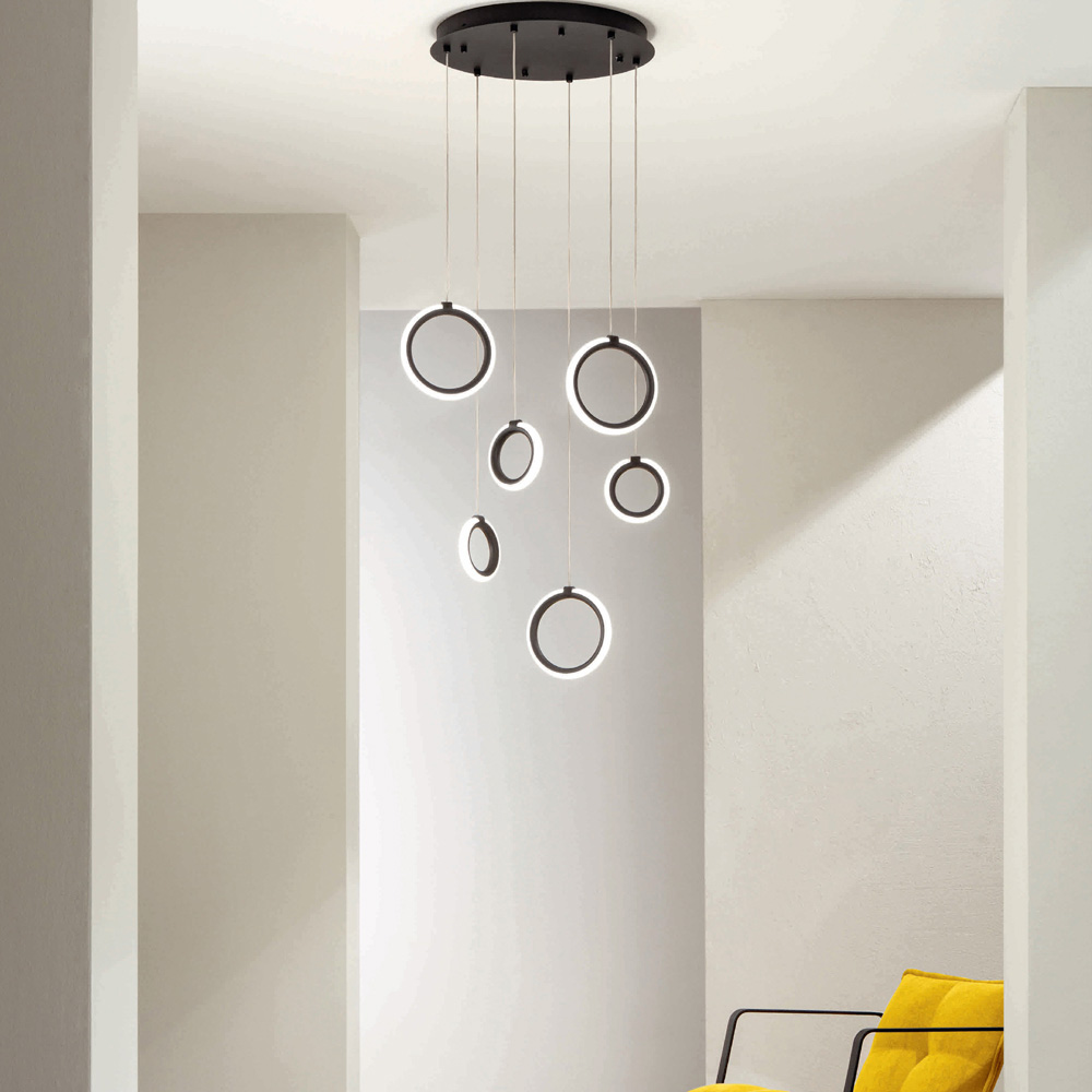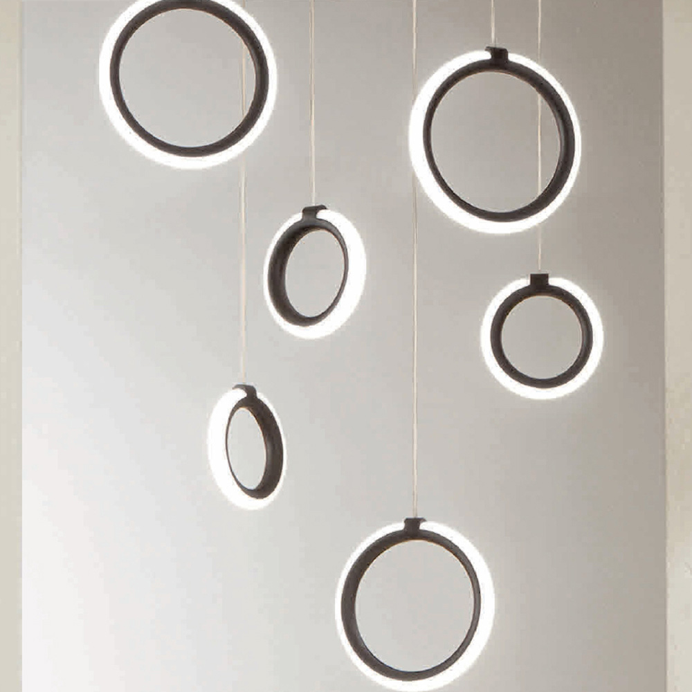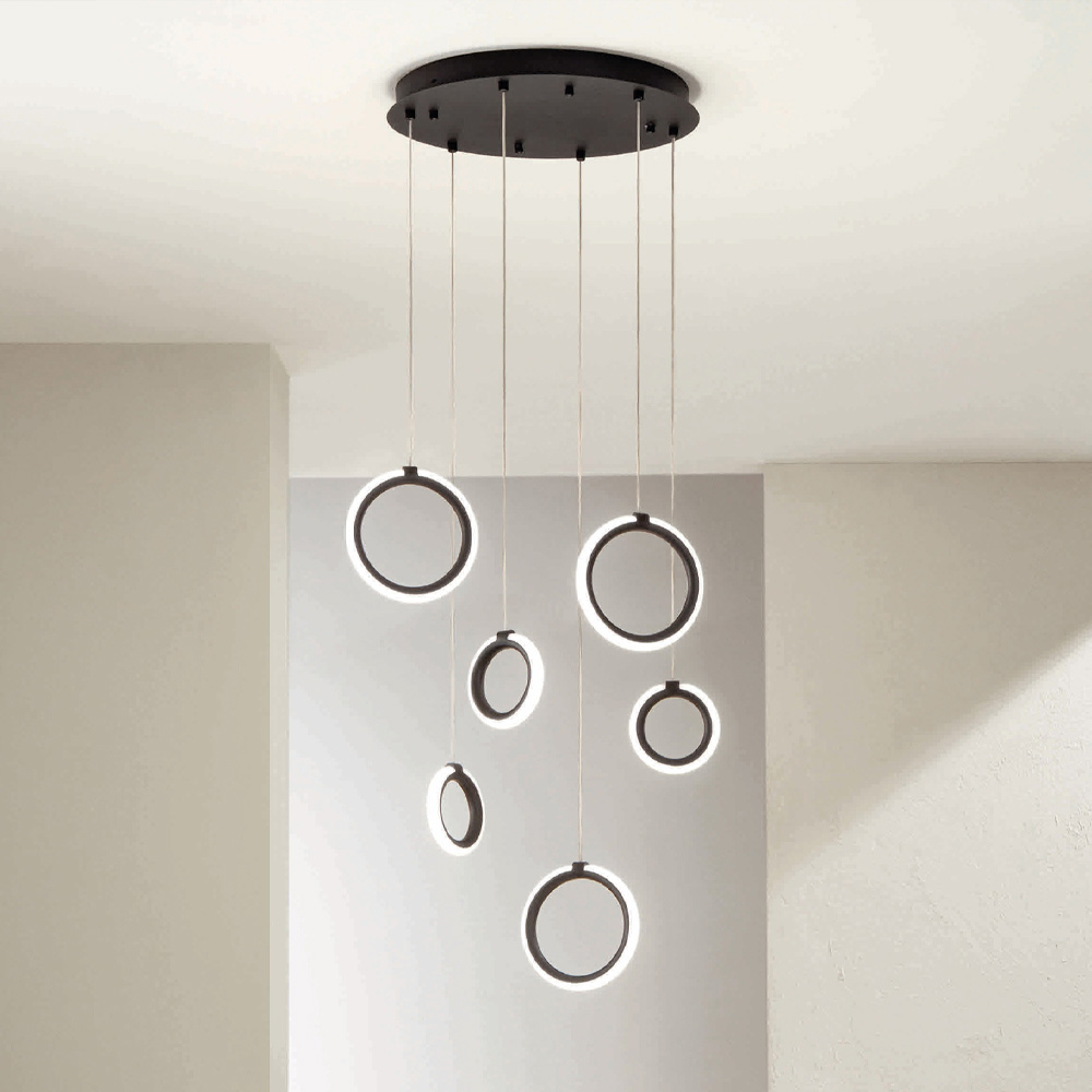 Lustre entièrement fabriqué en Italie en métal peint en noir avec câbles réglables en longueur et 6 lumières LED circulaires dimmables . Ce produit vise à valoriser la tradition à travers une approche contemporaine où style, classe et innovation fusionnent pour créer de nouvelles formules de design pour meubler et illuminer n'importe quel environnement avec goût et caractère. Les points forts sont la particularité des formes , la qualité des matériaux et l' unicité de la source lumineuse .