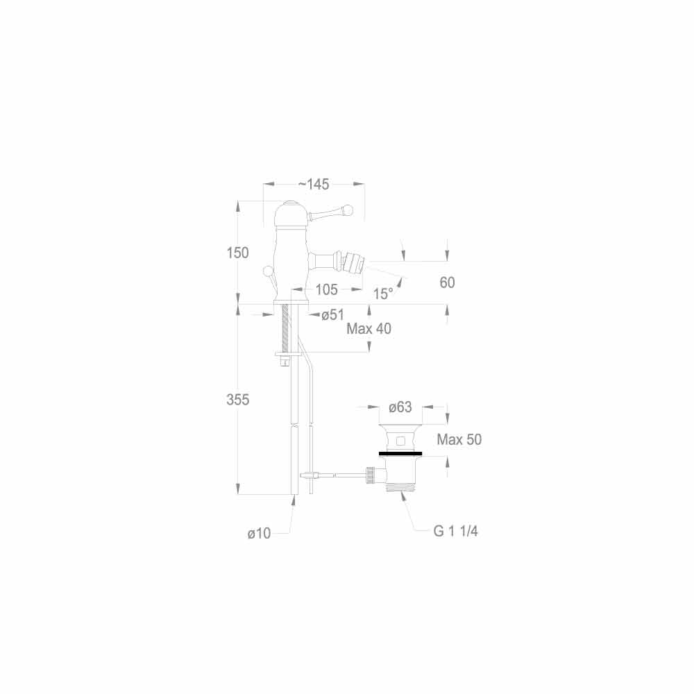 Mélangeur de bidet à poser au design classique en laiton chromé de 150 mm de hauteur et 105 mm d'entraxe, avec drain et tirette. Entièrement produit en Italie avec des matériaux de haute qualité conformes aux normes européennes. Ce mélangeur peut être installé sur le dessus, équipé d'un aérateur réglable et d'une cartouche à disque en céramique; recommandé pour son système Energy Saving pour une économie d'eau de 6L / min et pour ses fixations rigides.