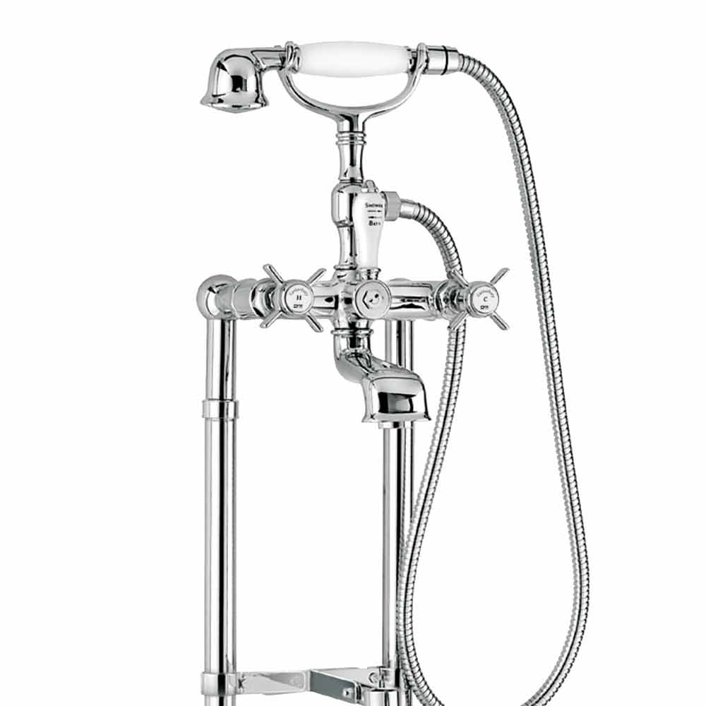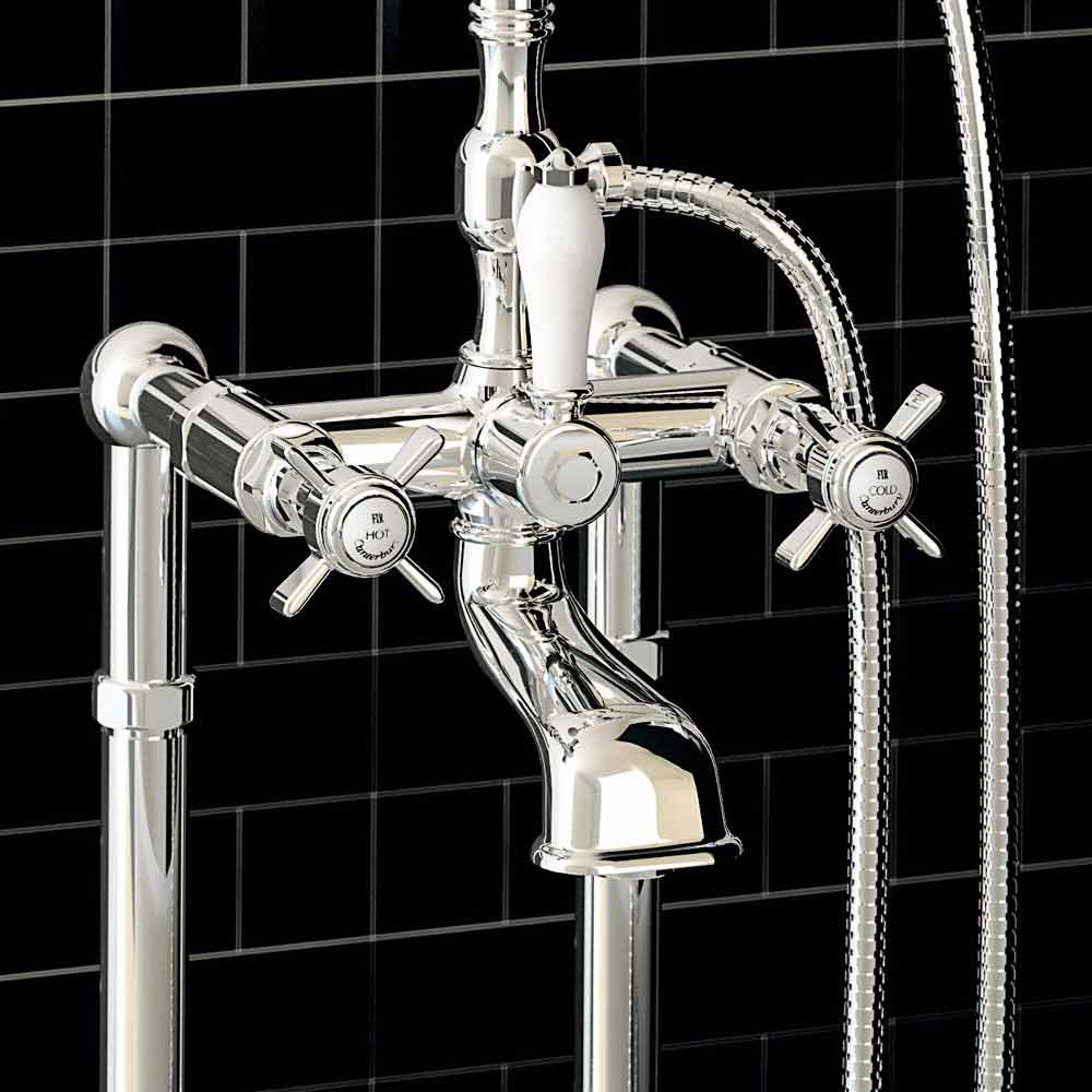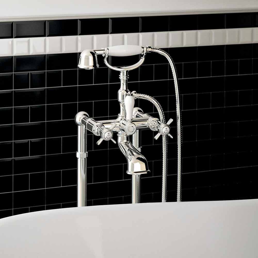 Robinet de bain extérieur sur colonnes de sol avec inverseur et douche duplex Made in Italy.