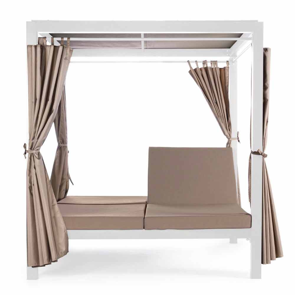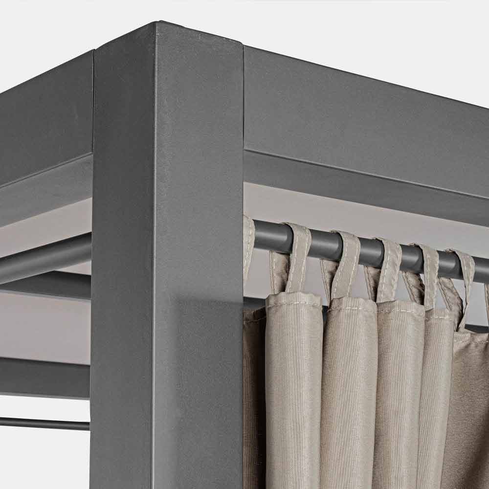 Structure en aluminium enduit de poudre, mâts 80x80mm, toile de toit et coussins d'assise (amovibles) en textilène 1x1 , rembourrage en mousse à séchage rapide pour une utilisation en extérieur. Dossiers inclinables à 4 positions et rideaux latéraux en polyester. A assembler.
