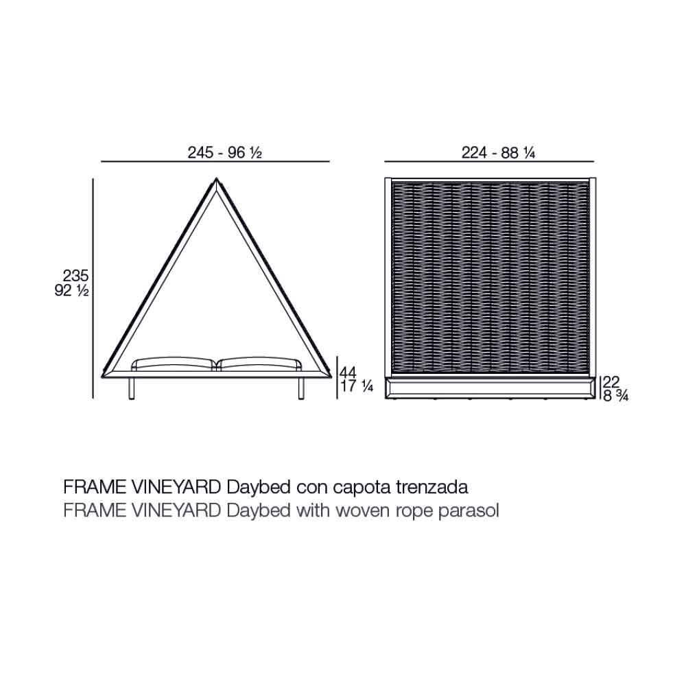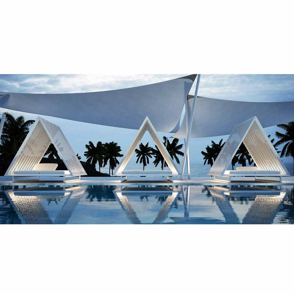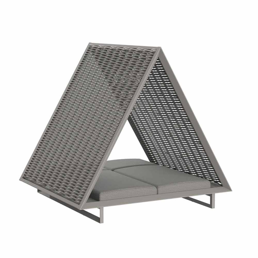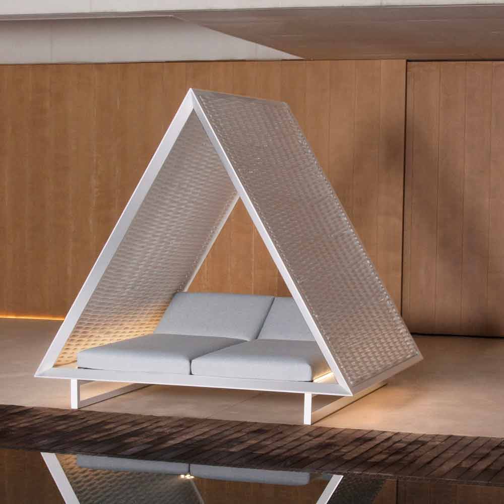 Lit de repos d'extérieur double, design luxueux et élégant avec structure en aluminium et parasol en corde tressée.