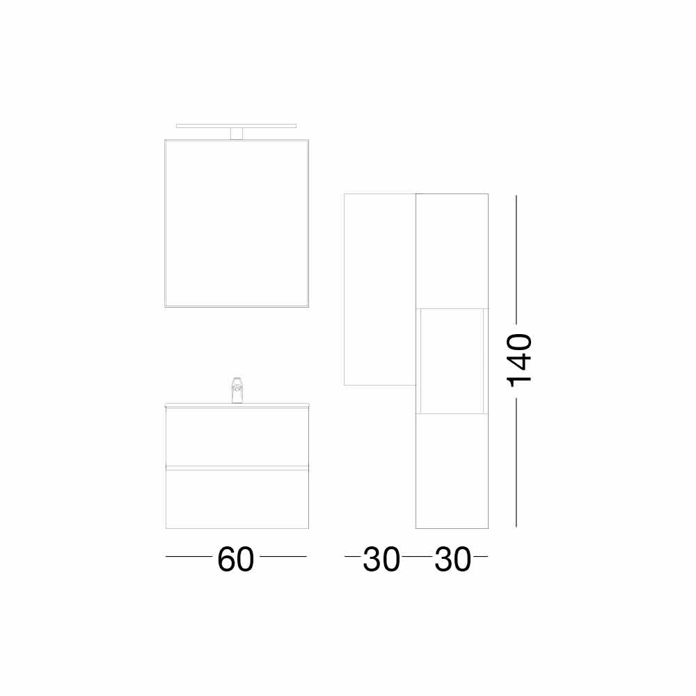 | Dimensions | Base avec lavabo: L 60 x P 46 x H 55 cm; Colonne: L 30 x P 17 x H 140 cm; Placard: L 30 x P 17 x H 80 cm |