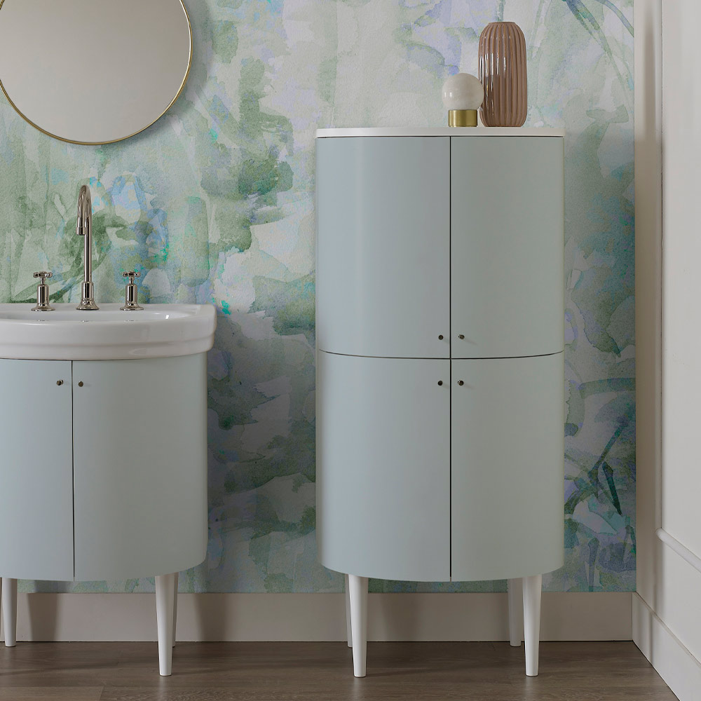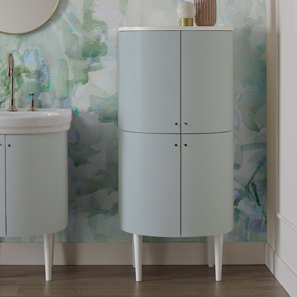 Colonne en MDF à quatreportesfinition mate bleu clairqui ferment trois étagères dont deux en verre et uneen Hydro MDF. L'étagère supérieure et les pieds sont en finition blanc mat et les boutons sont inclus en finition nickel .