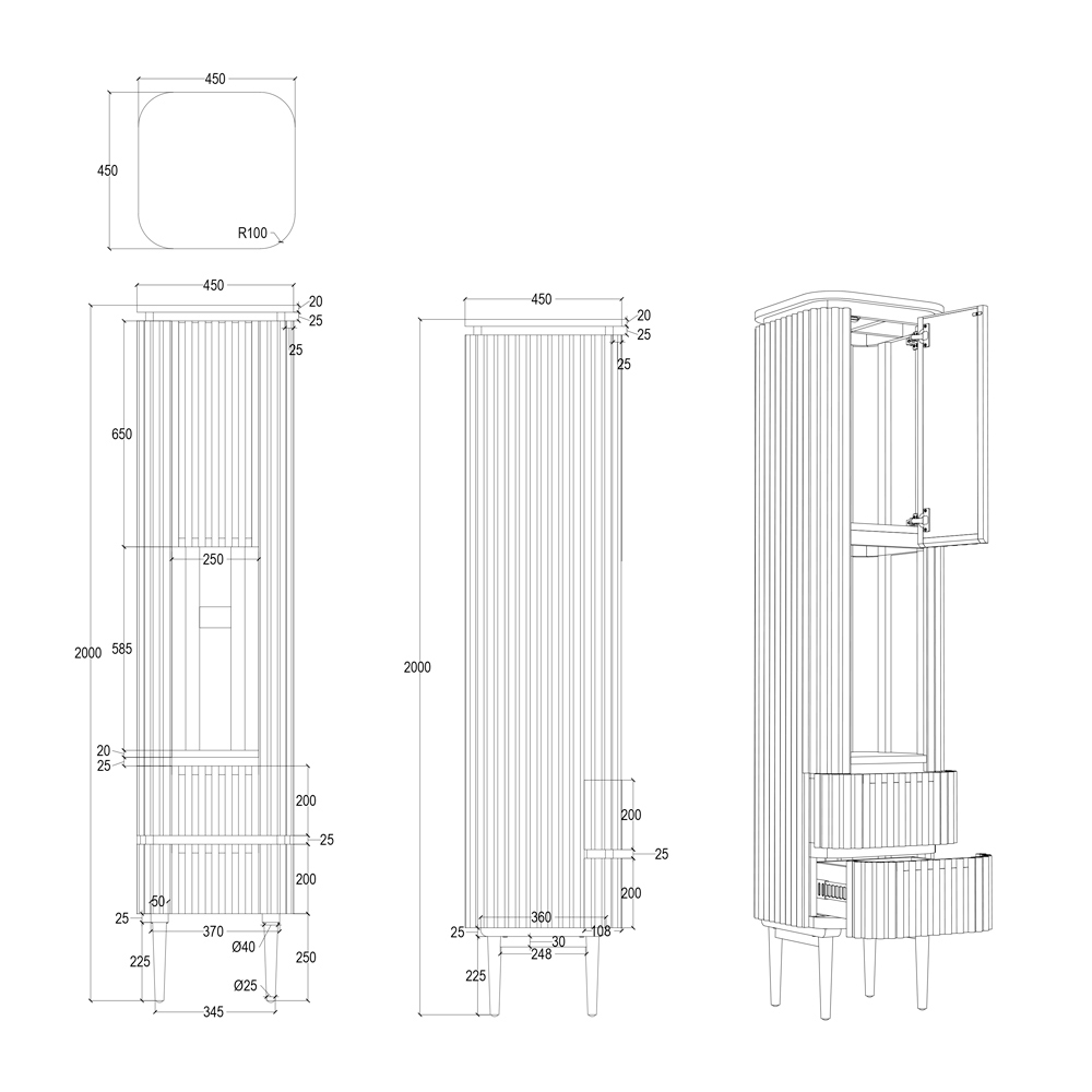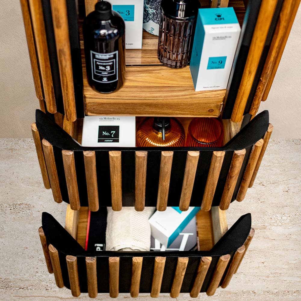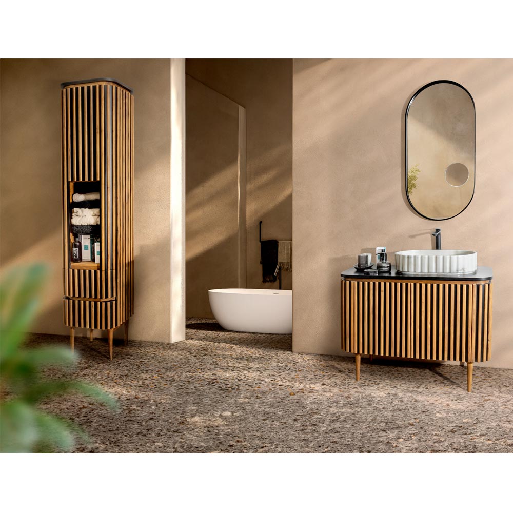 Ce meuble de salle de bain colonne en teck massif et acajou est un bijou de design, avec ses formes courbes et lisses , sans bords ni poignées visibles. La silhouette arrondie et l'absence de détails superflus créent une esthétique moderne et minimaliste, parfaite pour un environnement de salle de bain contemporain. Il offre une grande porte à fermeture lente presque invisible qui cache un espace de rangement généreux tandis que l'espace central « ouvert » se connecte aux deux précieux tiroirs du dessous. La fusion du teck chaud avec les riches nuances de l'acajou donne une touche naturelle et élégante .