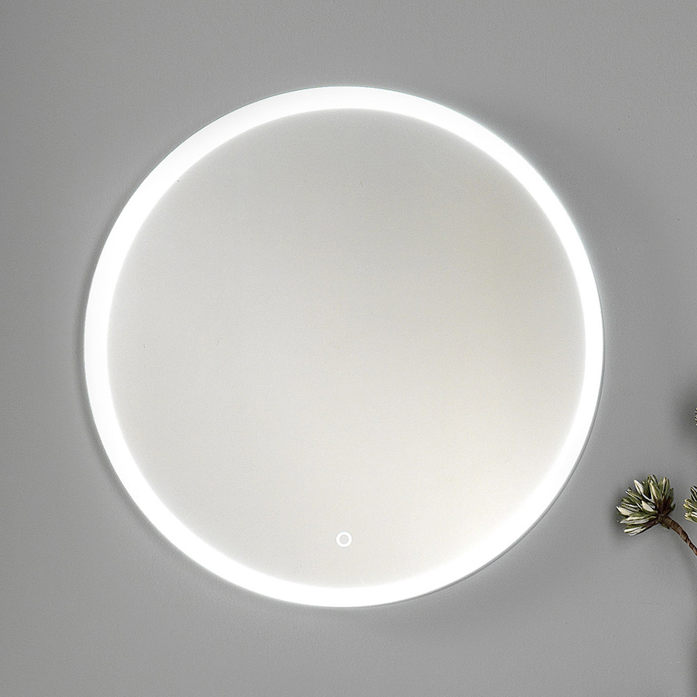 miroir rond de 70 cm de diamètre avec éclairage LED intégré et bord en métal peint en blanc mat.