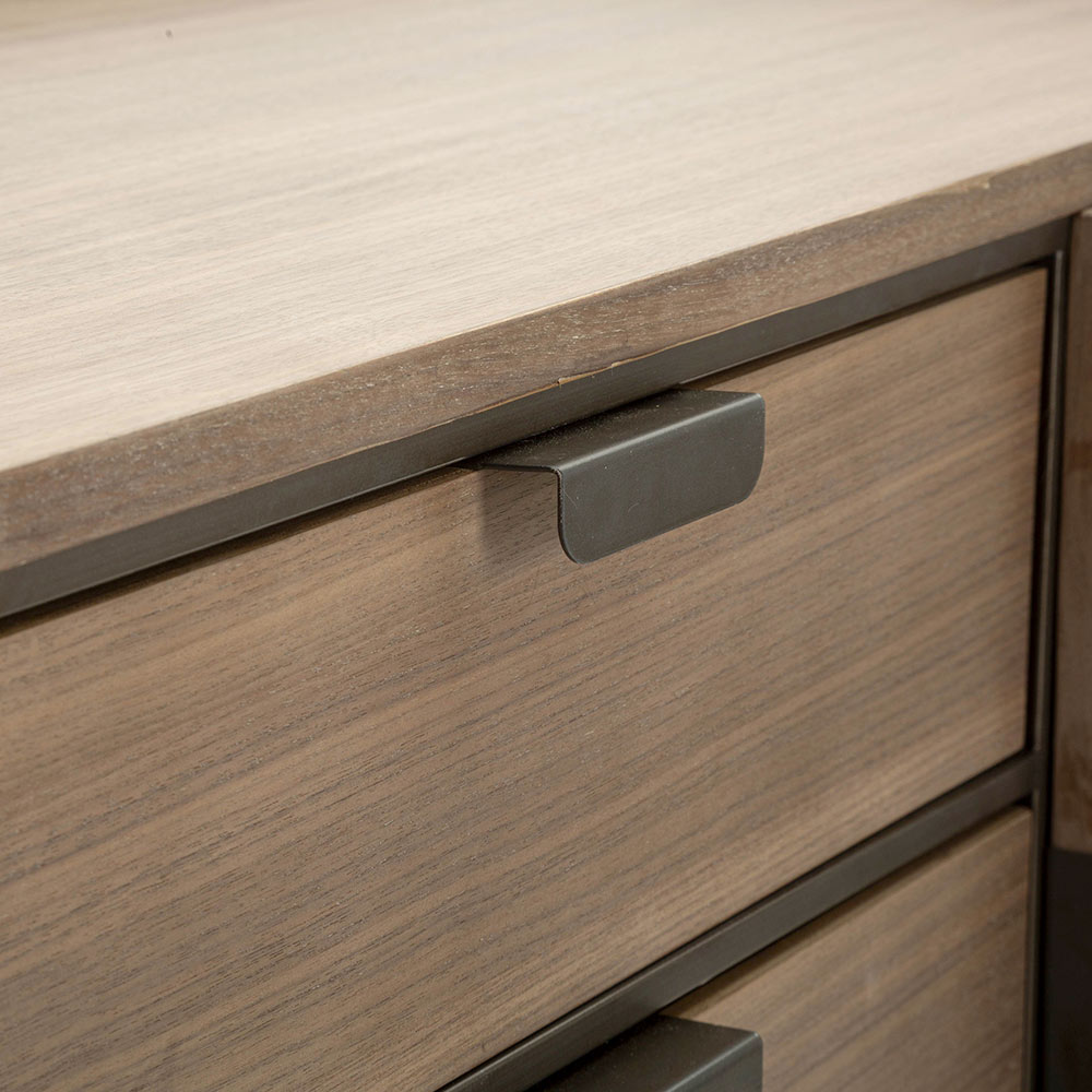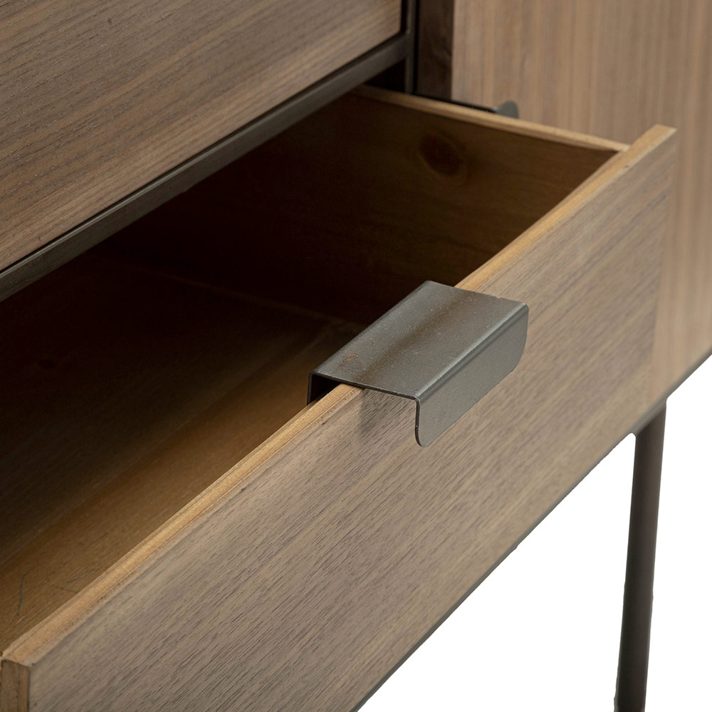 Ce buffet en bois et fer est la quintessence de l'élégance fonctionnelle et du design raffiné. Avec ses lignes épurées et son style minimaliste , il s'intègre discrètement dans n'importe quel environnement, tout en offrant une grande surface et un espace utile pour ranger de petits objets grâce à ses tiroirs pratiques et faciles à manipuler. La finition en bois sombre ajoute une sensation de chaleur et de richesse , tandis que la construction robuste assure durabilité et stabilité .