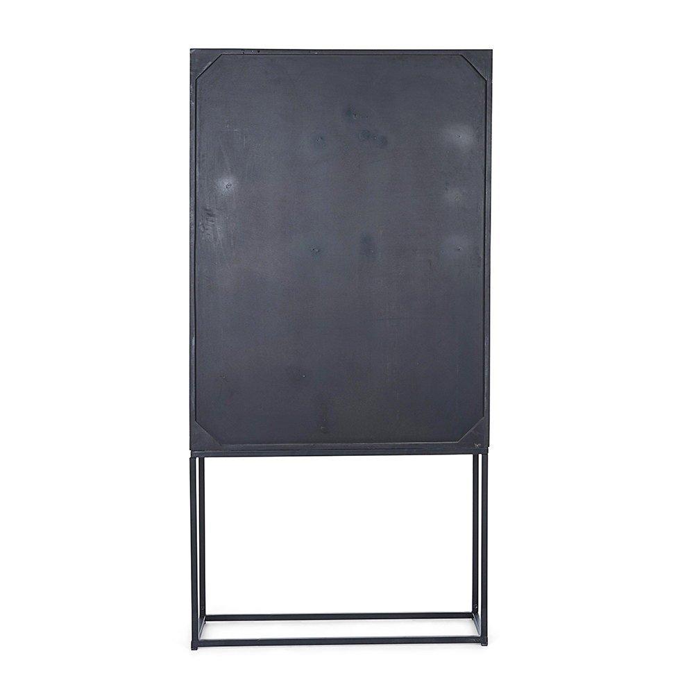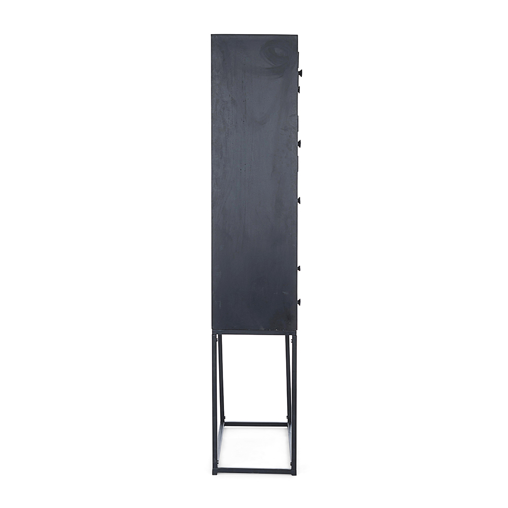 Ce buffet design pour le salon présente une structure en bois de manguier avec un dossier en MDF, des portes et tiroirs et des boutons en acier.