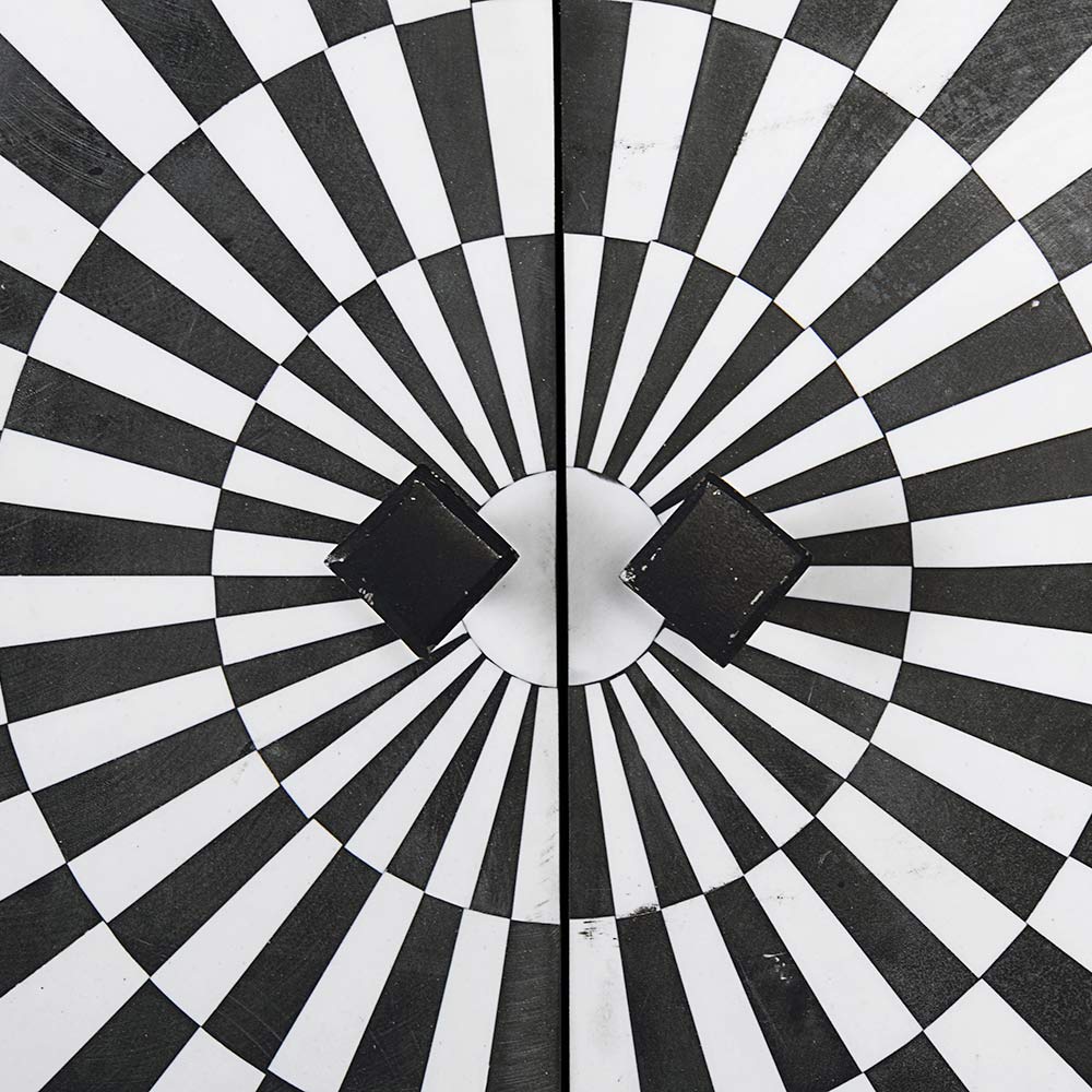 Les 4 portes et 6 tiroirs sont réalisés avec un traitement en mosaïque grâce à l'utilisation de petits blocs de résine avec une finition à base de nitrocellulose.