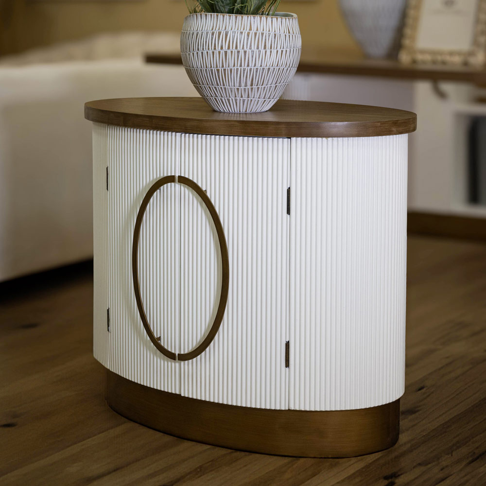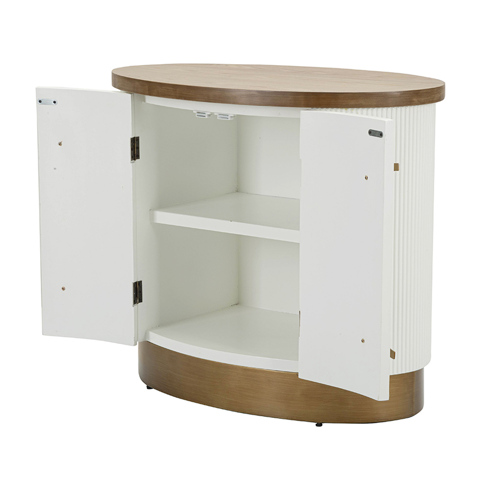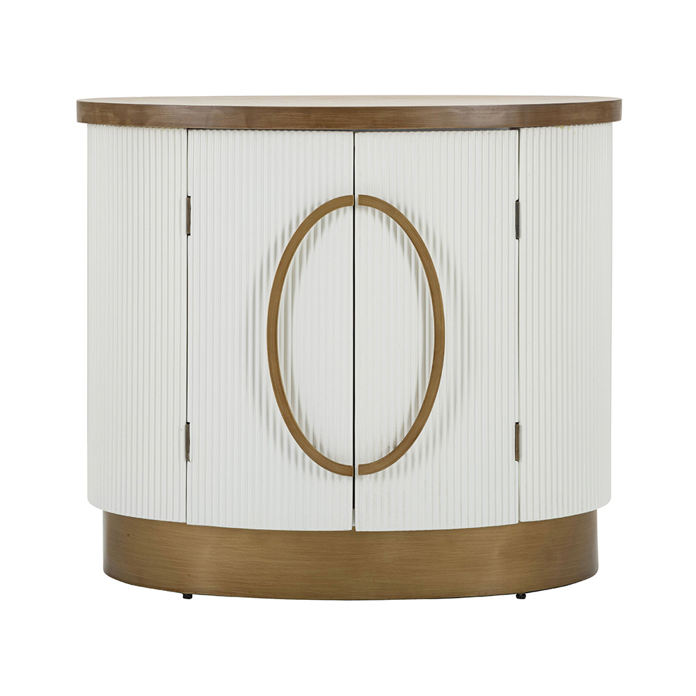 L'ingénieuse rainure des portes ajoute un délicat jeu d'ombre et de lumière, tandis que les poignées circulaires apportent une touche de raffinement . Ce meuble offre non seulement un point d'intérêt esthétique, mais également une capacité de rangement abondante, le rendant aussi pratique que beau.