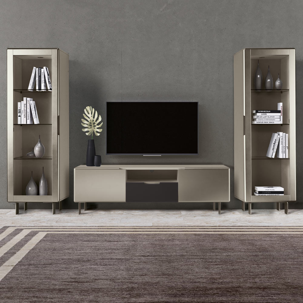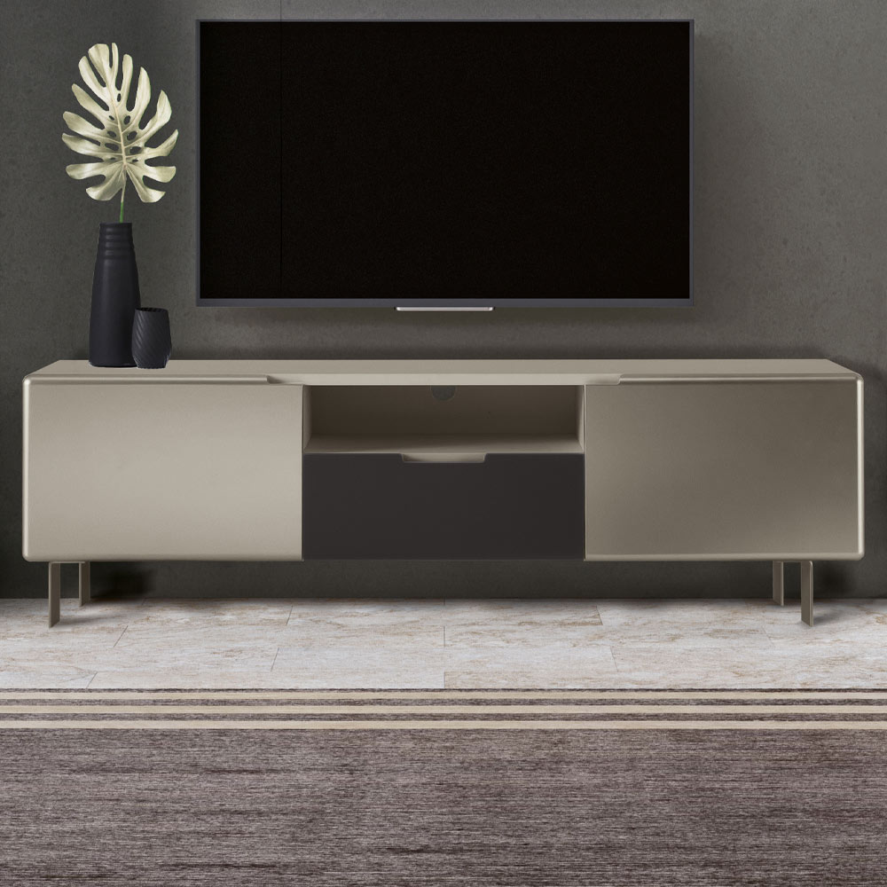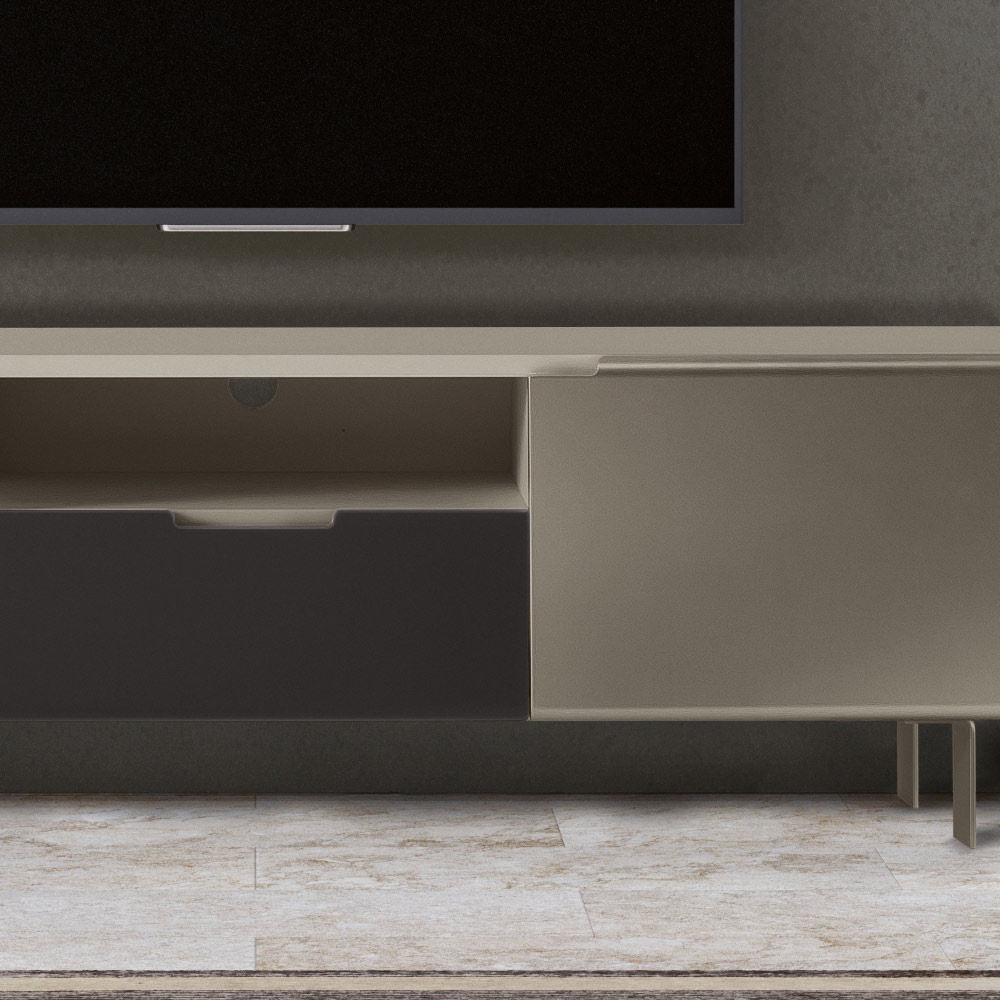 Le meuble TV est un accessoire d'ameublement très important dans chaque maison et remplit de multiples rôles : du support du téléviseur à la fonction esthétique et décorative. Produit moderne et élégant en MDF composé de 2 portes finition nickel qui s'ouvrent avec des charnières amorties , d'un corpsfinition vison et de piedsen fercouleur nickel , d'un tiroir finition anthracite et d'un compartiment ouvert qui garantissent un espace de rangement supplémentaire. C'est un accessoire d'ameublement au design minimaliste qui combine une esthétique élégante avec une large utilité et s'intègre parfaitement dans n'importe quel salon créant une harmonie parfaite avec les éléments environnants.