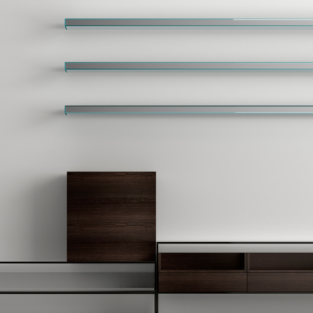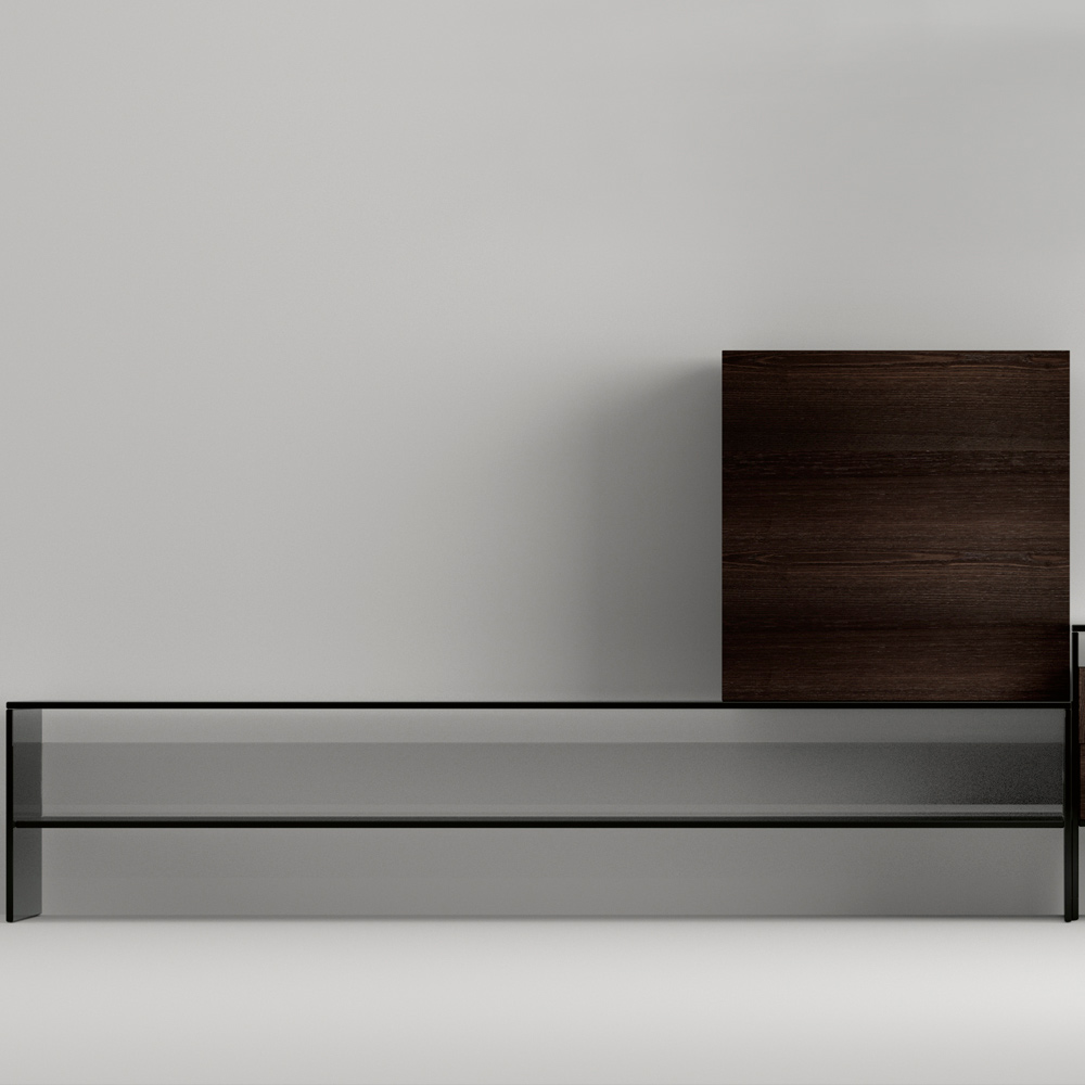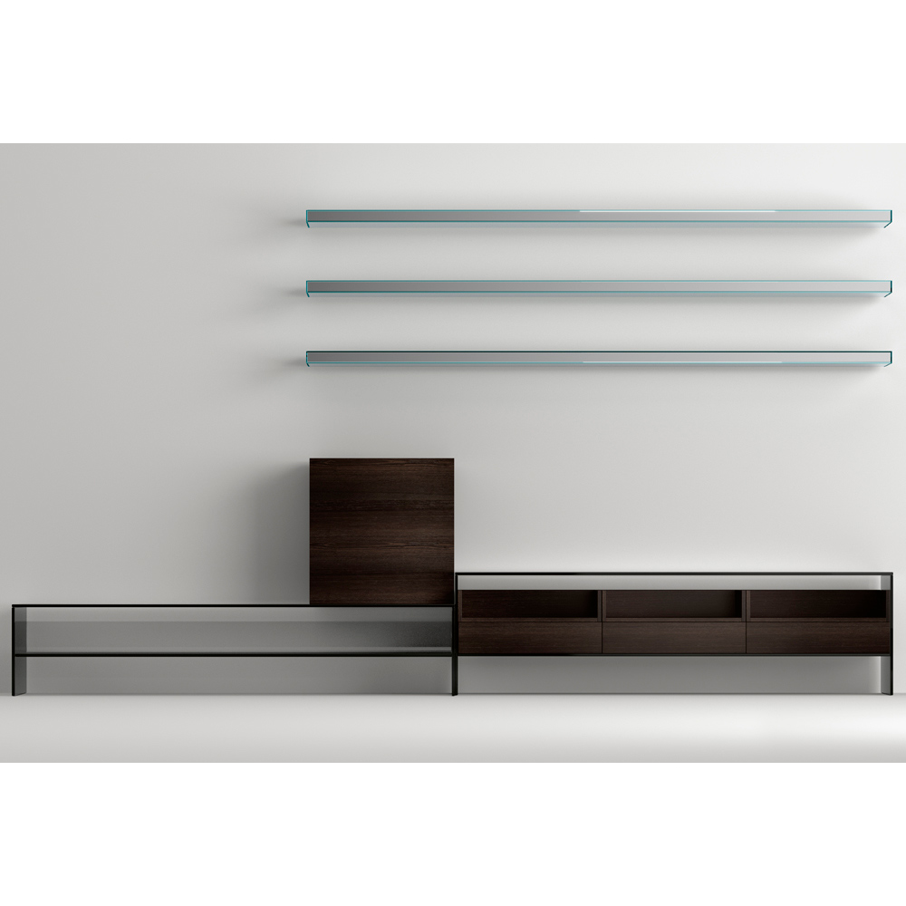 Meuble TV composé de : 3 étagères recouvertes de miroir fumé, 1 élément modulaire en verre soudé finition fumée avec un caisson à charnière en bois finition frêne de Sibérie au-dessus avec une étagère intérieure en verre, 1 élément modulaire en verre soudé finition fumée avec 3 tiroirs et 3 ouverts compartiments en bois finition frêne de Sibérie. Une nouvelle interprétation du système jour qui fait de la légèreté du verre sa principale qualité. La composition peut être conçue en toute liberté pour s'adapter au mieux à tous les besoins et à tous les styles d'ameublement.