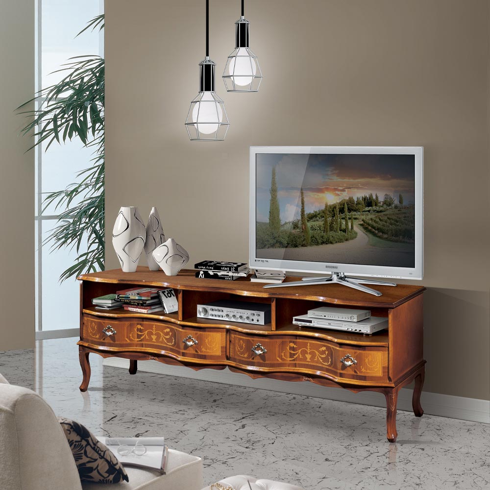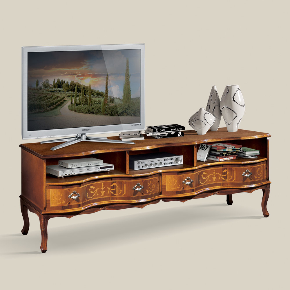 Meuble TV en bois de style classique avec compartiments et tiroirs, fabriqué en Italie.