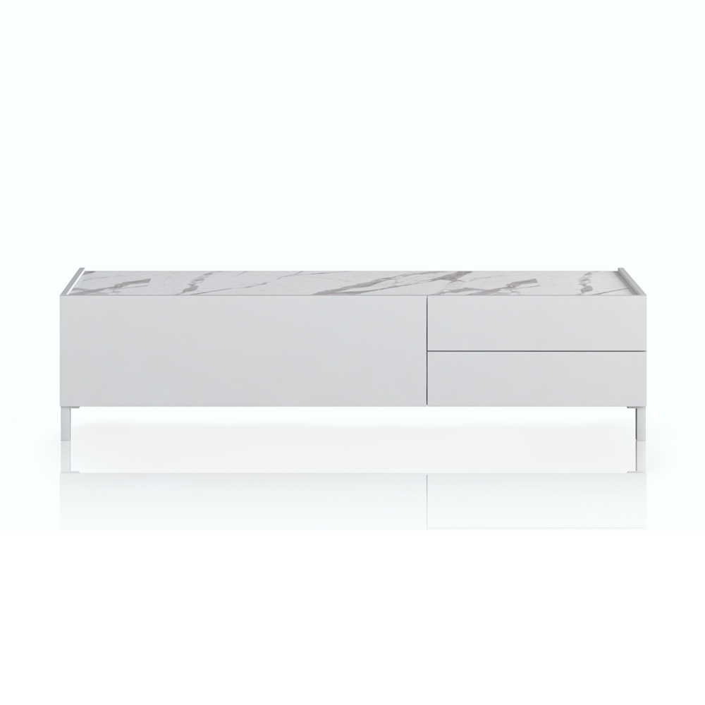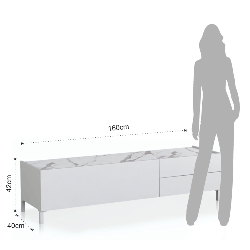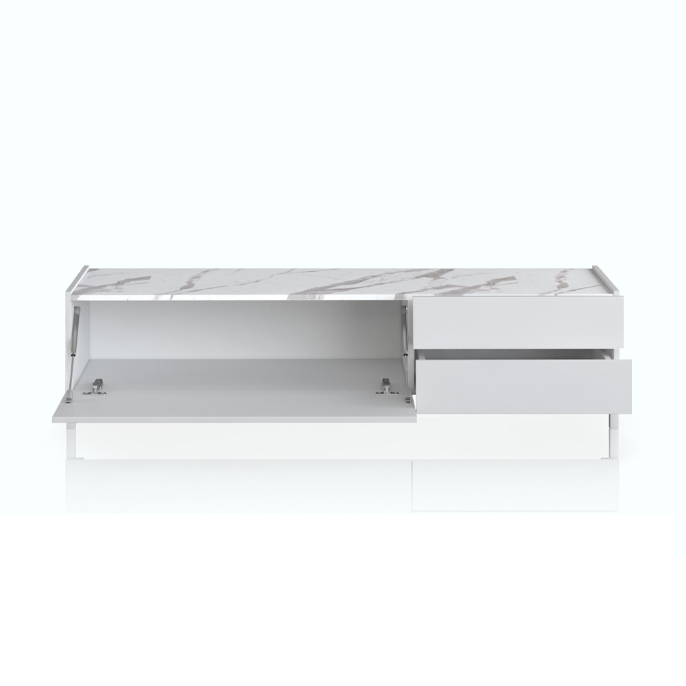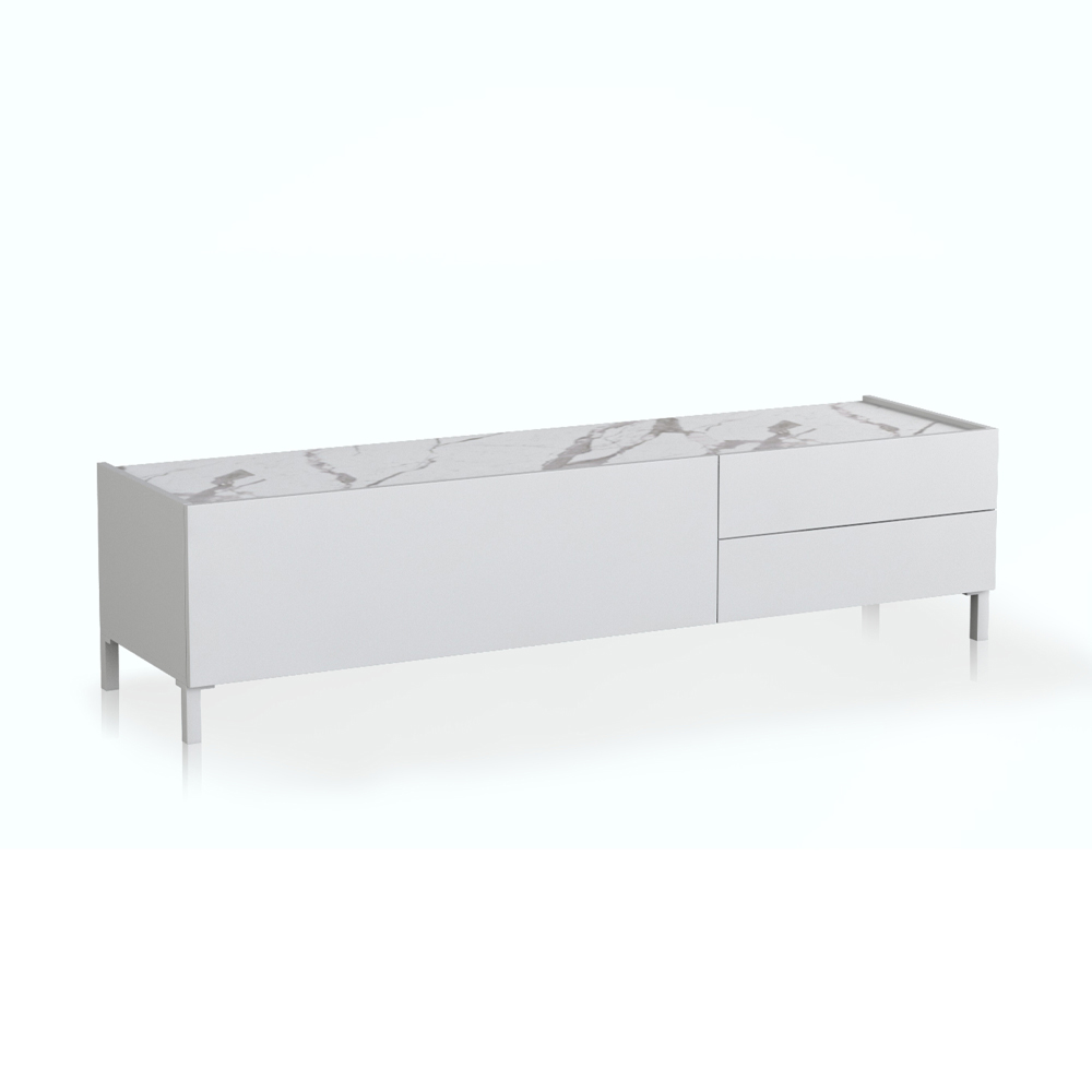 Meuble TV réalisé en panneaux de particules de bois écologiques de 15/16 mm d'épaisseur, laqué blanc brillant , plateau recouvert de mélamine finition Marbre Calacatta , avec 1 porte abattante, 2 tiroirs et pieds réglables , entièrement . Grâce à ses finitions, ce meuble est parfait pour compléter l'ameublement de n'importe quel salon et salon. Il offre une grande capacité et un espace pour ranger les objets afin de les avoir toujours bien rangés et à portée de main grâce aux portes et tiroirs.