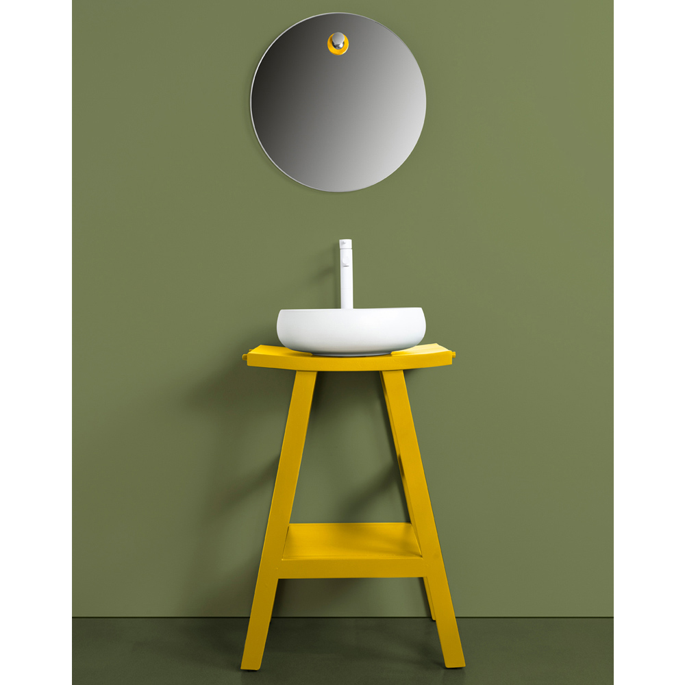 Meuble de salle de bain au sol en teck naturel récupéré peint en jaune , une couleur chaude et ensoleillée qui transmet une forte charge d'énergie, transmettant la positivité dès le premier regard. Sa structure se caractérise par la forme légèrement incurvée du plateau qui offre une touche exclusive et raffinée à l'esthétique du produit. Complet avec 4 crochets porte-serviettes pratiques et une étagère de rangement fonctionnelle.