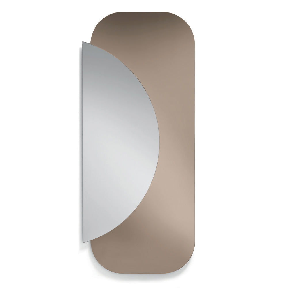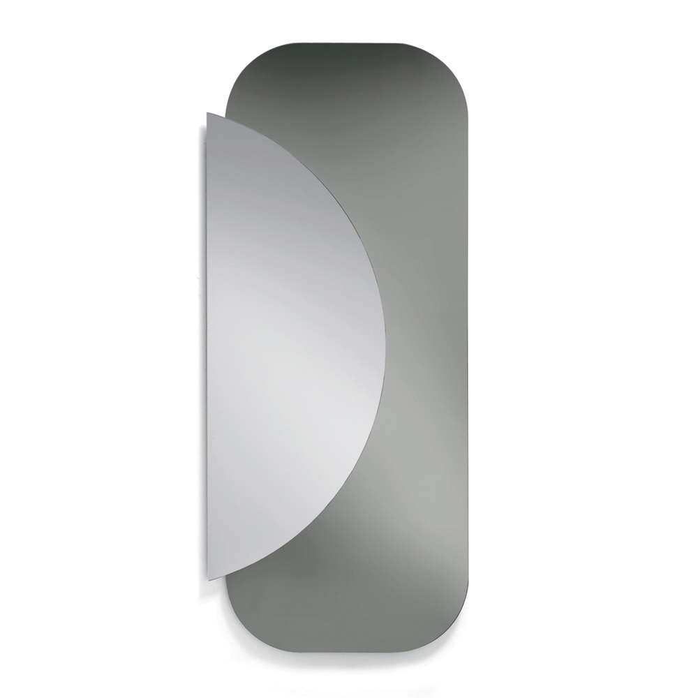 La composition se compose de deux plaques de formes superposées : une base rectangulaire aux angles arrondis et un demi-cercle de miroir naturel qui se chevauche, créant un dialogue élégant entre géométrie et reflets. Ce contraste entre formes et matières produit un effet visuel dynamique et contemporain.