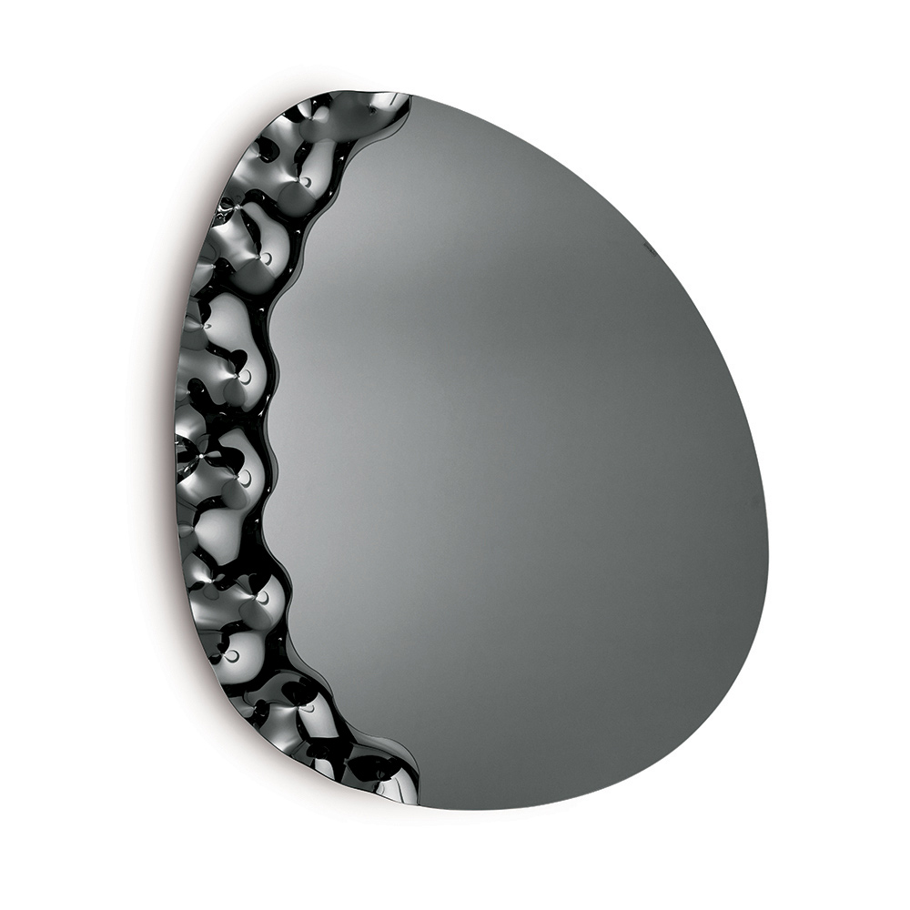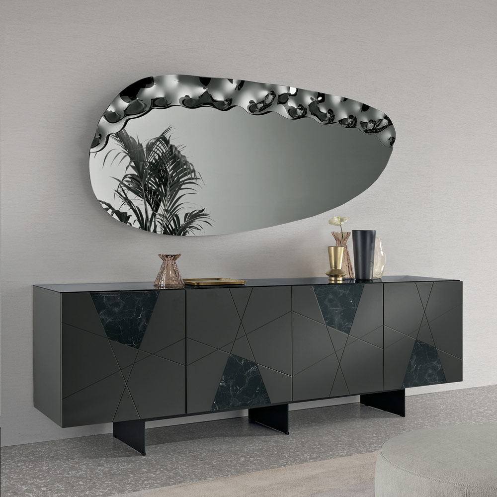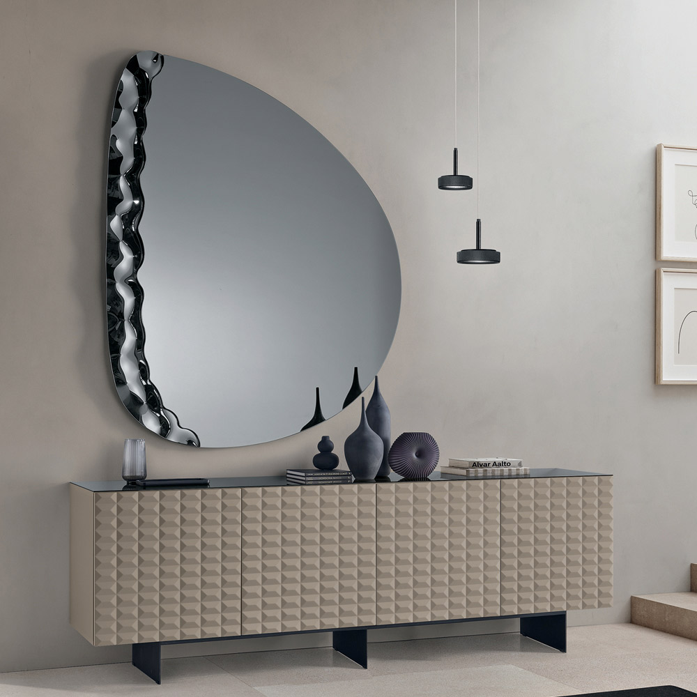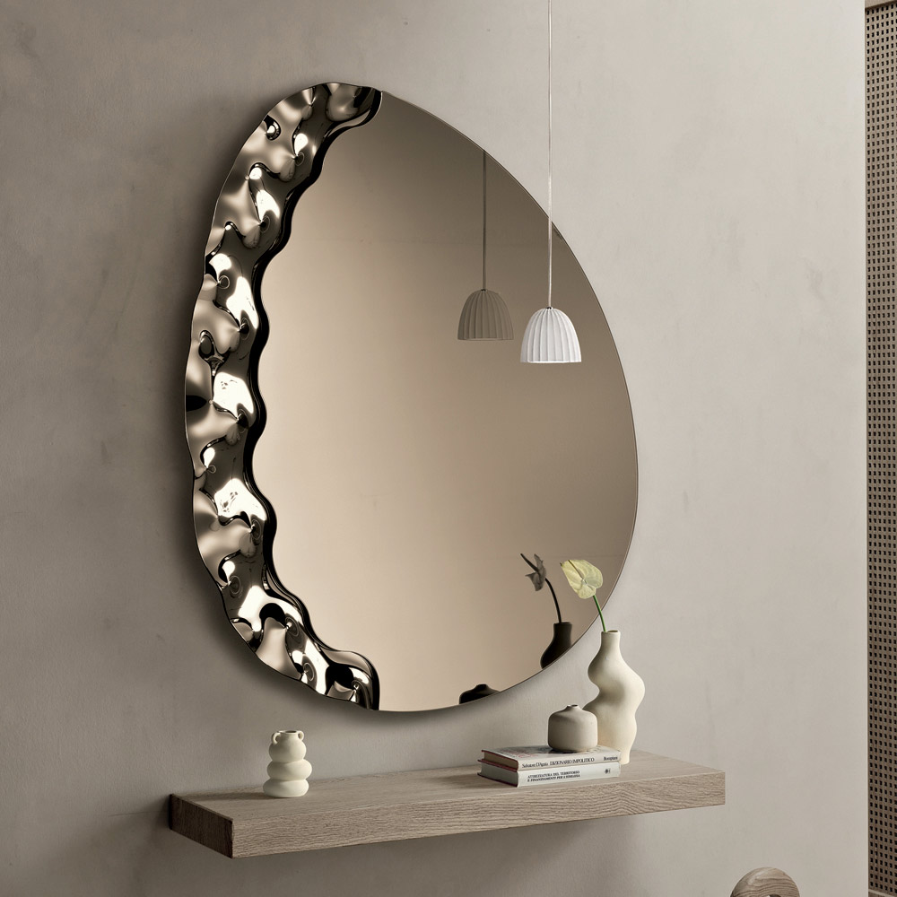 Un élégant miroir mural conçu en Italie , idéal pour sublimer des espaces tels que l'entrée , le salon ou la chambre . Son design contemporain allie lignes douces et détails texturés, transformant le miroir en un élément décoratif raffiné qui habille avec élégance le mur.