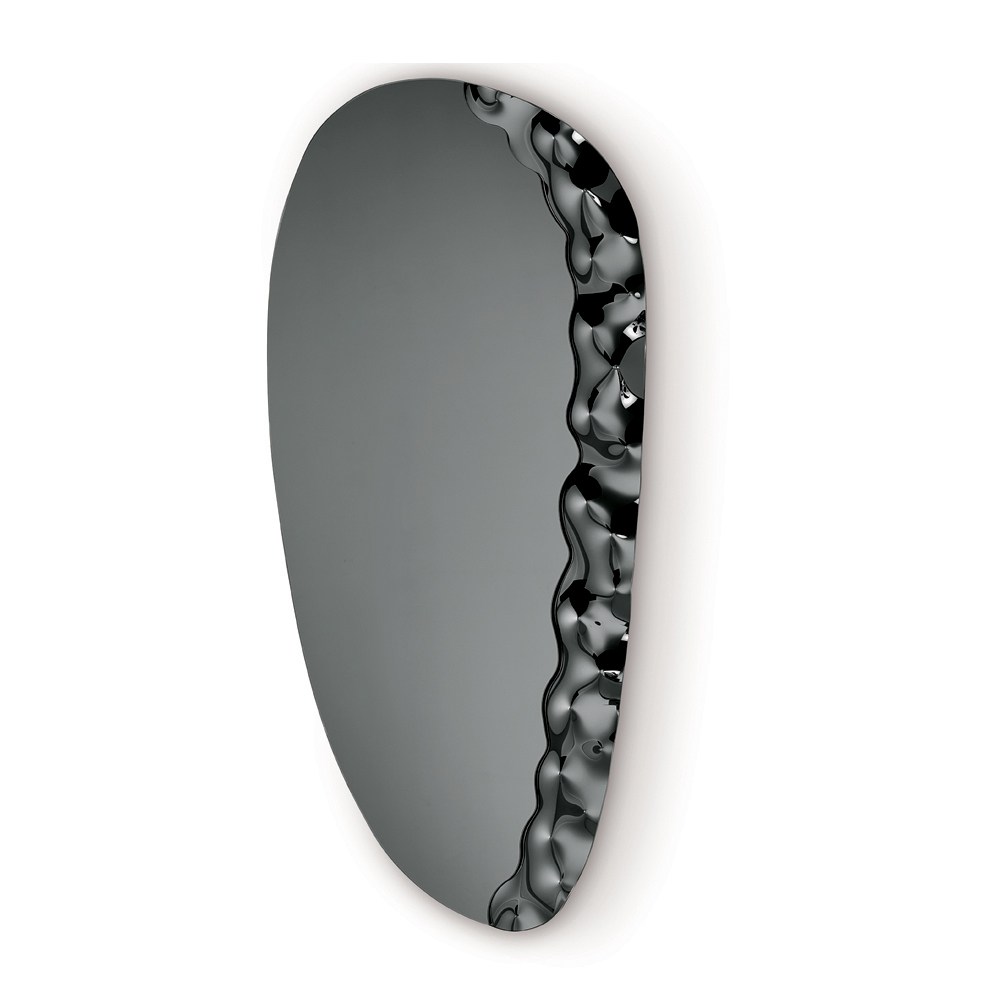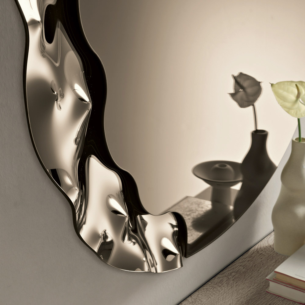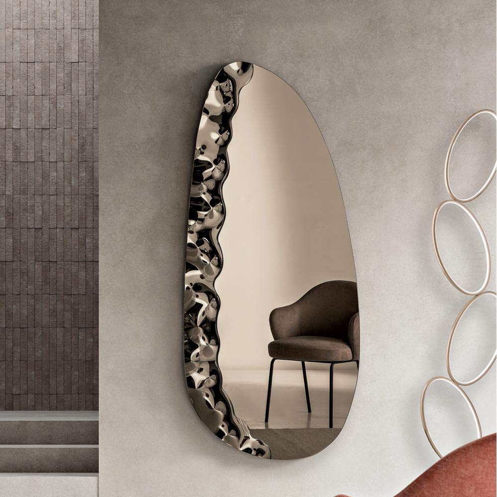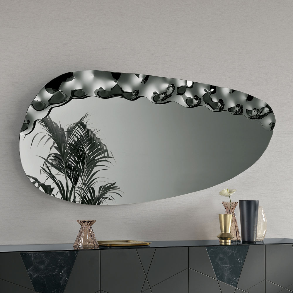 Ce miroir se distingue par un insert latéral en verre texturé ton sur ton , créant un jeu subtil de surfaces et de textures. Cet élément décoratif semble servir de support au panneau miroir, générant un effet visuel léger et sophistiqué qui confère de la profondeur à la composition.