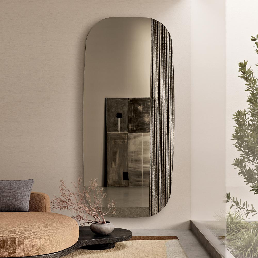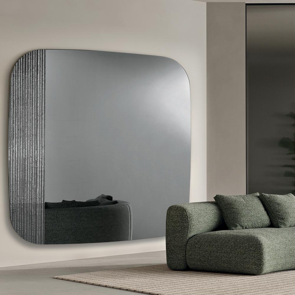 La surface réfléchissante présente une forme profilée aux angles légèrement arrondis , conçue pour créer un effet visuel doux et harmonieux. Le design est rehaussé d'un insert en verre côtelé argenté ton sur ton qui ajoute profondeur et mouvement, créant un jeu subtil de lumière et de texture à la surface du miroir.