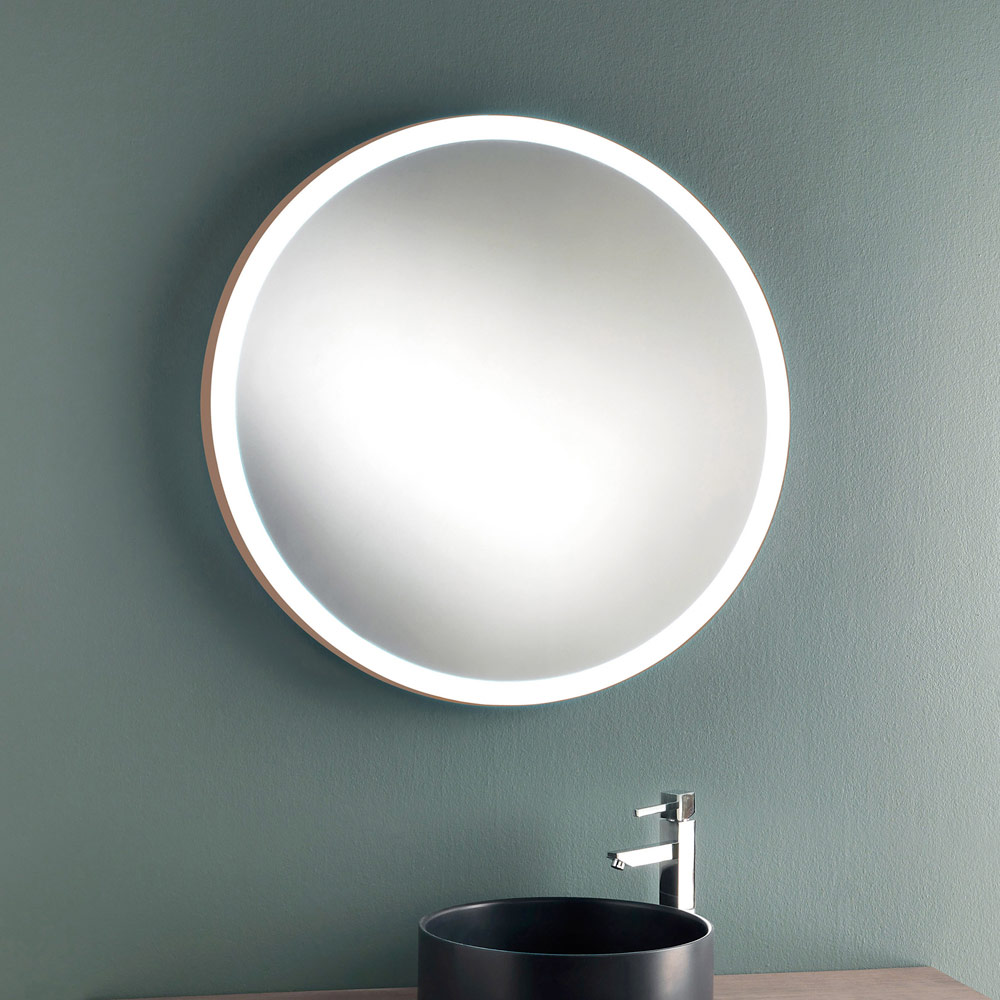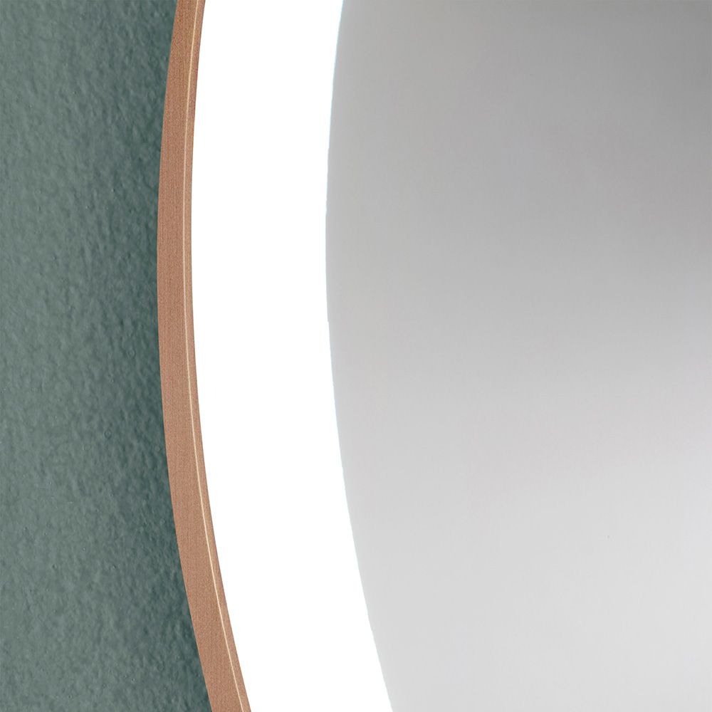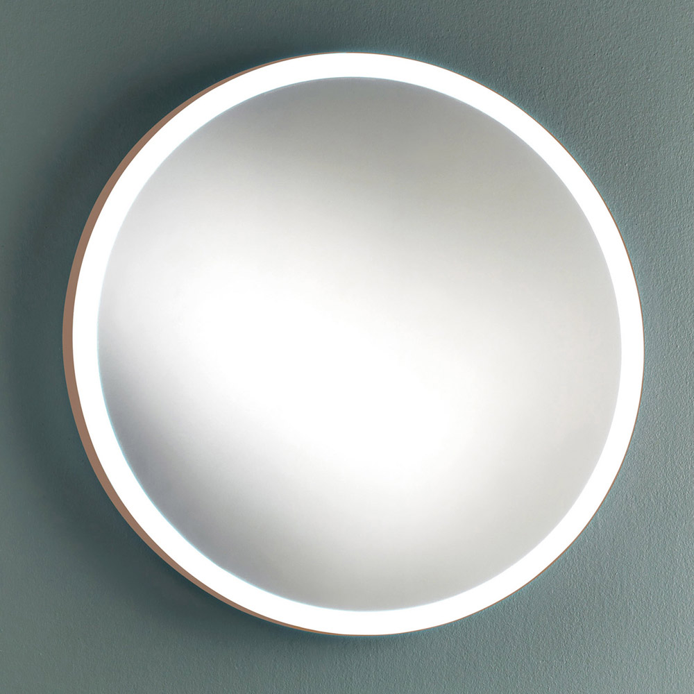 Miroir mural rond avec cadre en métal cuivré et éclairage led, fabriqué en Italie.