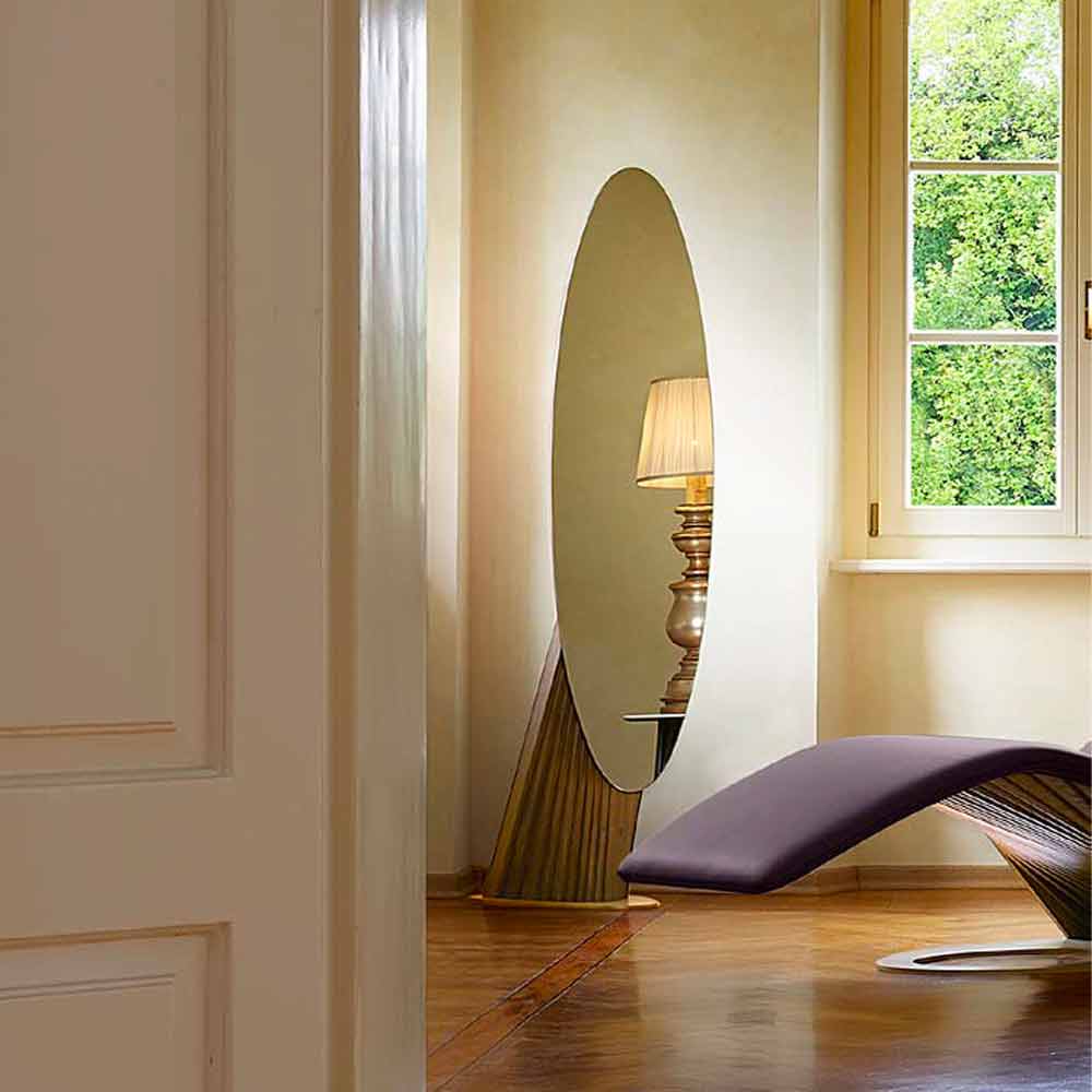 Miroir de plancher avec une structure faite de bandes de bois de frêne huilé à la main avec retour dans la finition de bronze et la base métallique. Fabriqué en Italie , ce meuble est conçu et conçu pour enrichir le décor de n'importe quelle pièce en reflétant chaque image sur sa surface raffinée et élégante caractérisée par la forme ovale allongée particulière. Ce qui rend le miroir unique, c'est la merveilleuse structure qui, grâce à la forme ondulée créée par les bandes, donne une impression de mouvement et de dynamisme à l'intérieur de la pièce, jouant ainsi un rôle aussi fonctionnel que décoratif. Ses dimensions et les matériaux utilisés assurent un produit solide et robuste avec une excellente durabilité qui s'adapte impeccablement à toute situation d'ameublement moderne, révolutionnant l'apparence de la pièce et augmentant sa valeur esthétique.